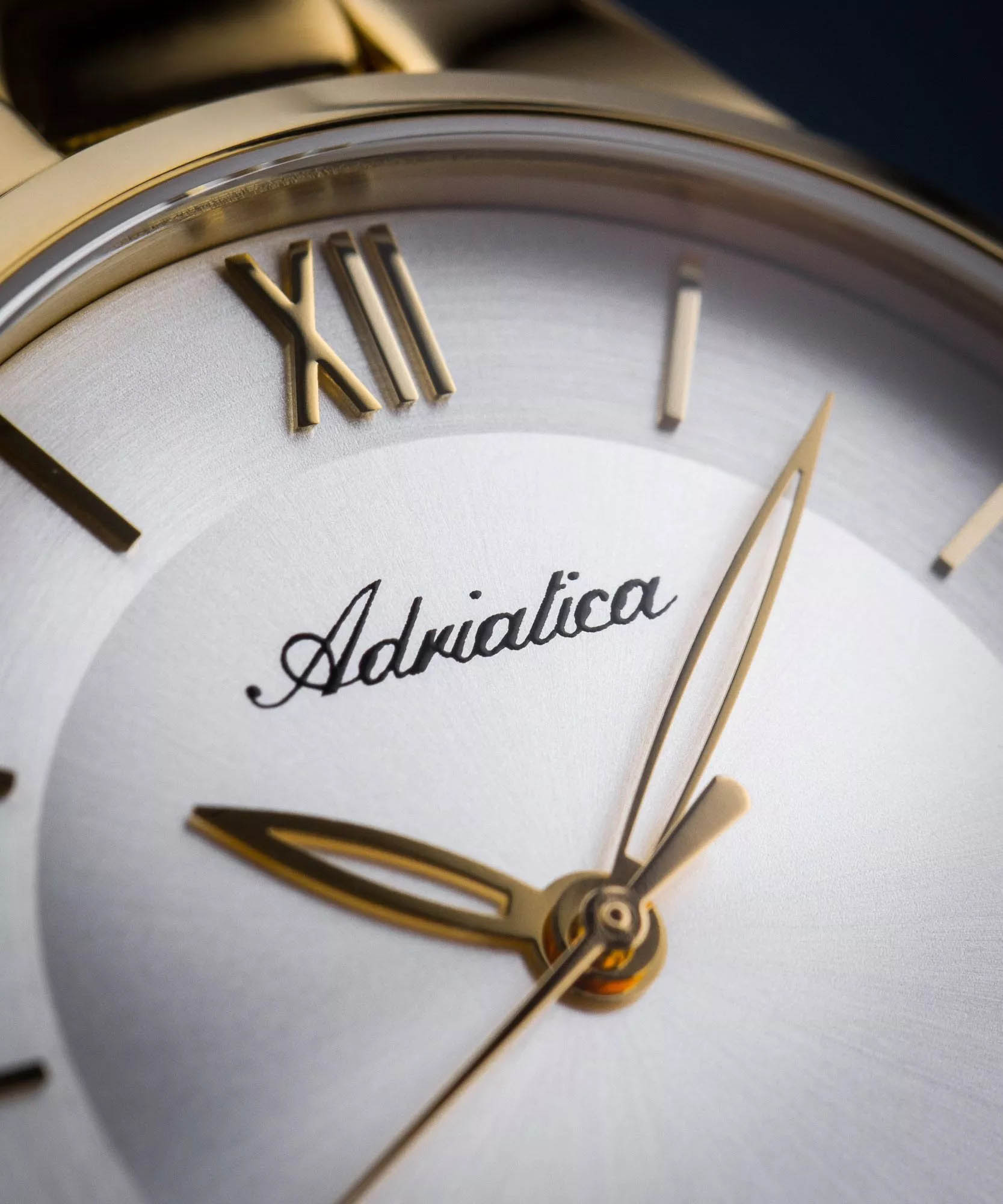Женские кварцевые часы Adriatica A3823.1163Q — это элегантный аксессуар швейцарского производства с корпусом круглой формы, выполненным из нержавеющей стали с PVD-покрытиемPVDУльтратонкое покрытие наносится в технике вакуумного напыления, сочетает в себе нитрид титана особой прочности со слоем золота или оксида хрома. Несёт в себе декоративную или защитную функцию. в цвете жёлтое золото. Циферблат серебристого цвета оформлен с эффектом «солнечных лучей» (Sunray), дополнен центральной секундной стрелкой. Защиту обеспечивает минеральное стеклоМинеральное стеклоМинеральное стекло представляет собой искусственно выращенный минерал кварца. Такое стекло отличается особой устойчивостью к повреждениям и царапинам. Уступает по некоторым качествам сапфировому стеклу.. Браслет из нержавеющей стали с PVD-покрытиемPVDУльтратонкое покрытие наносится в технике вакуумного напыления, сочетает в себе нитрид титана особой прочности со слоем золота или оксида хрома. Несёт в себе декоративную или защитную функцию. фиксируется на раскладной застёжкеРаскладная застёжкаТакой тип застёжки используется только на браслетах из металла. Она никогда не раскрывается полностью, происходит разделение на 2 и более частей. Раскладывающая застёжка снизит вероятность потери часов к минимуму.. Водонепроницаемость 30 метров, позволит защитить корпус от случайных брызг или капель дождя.