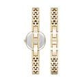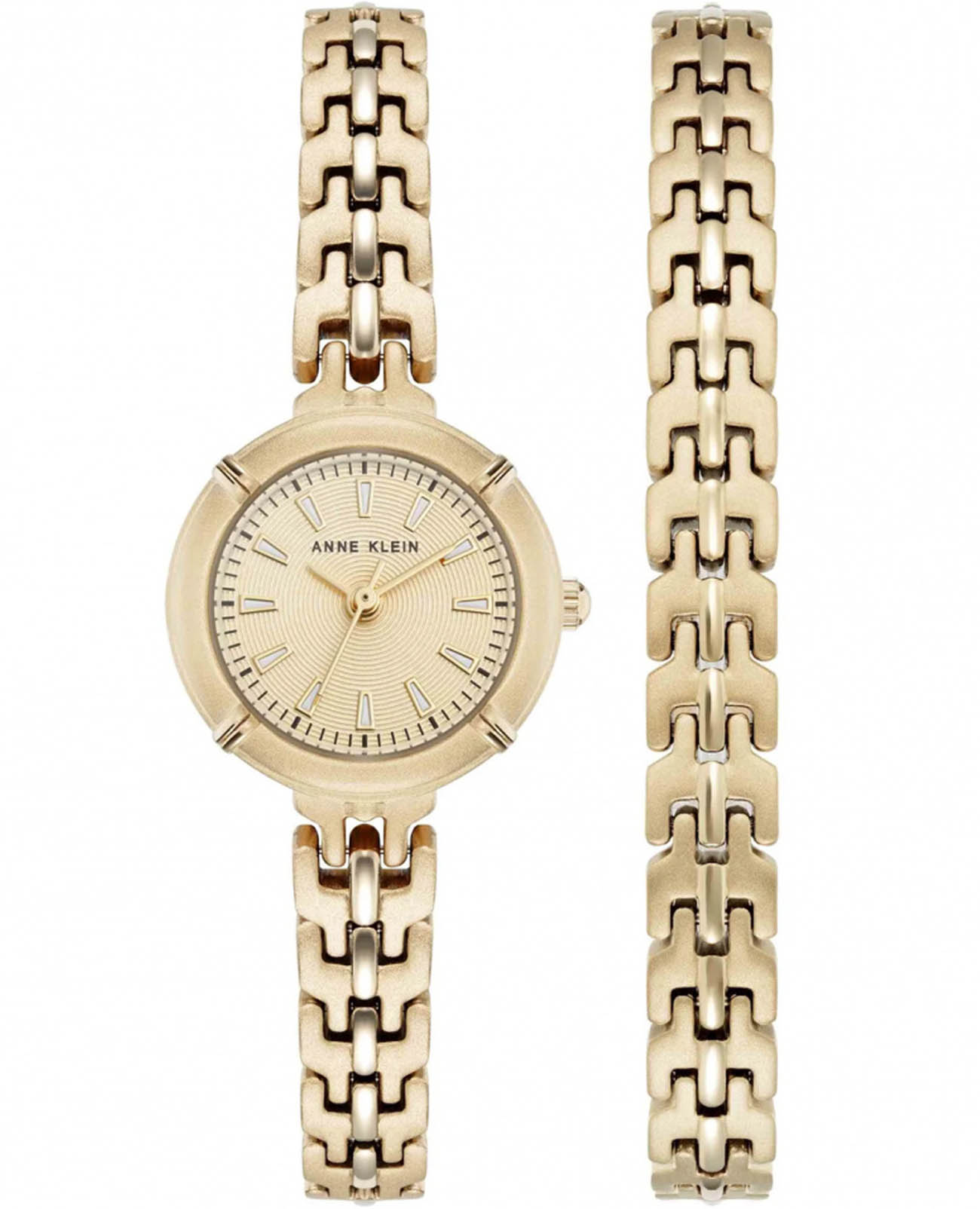 Женские кварцевые часы Anne Klein Box Set 5230GPST представляют собой элегантный аксессуар с круглым корпусом 22 мм из стали с IP-покрытиемIP-покрытиеМетод ионного напыления. Демонстрирует повышенную устойчивость к истиранию, окислению и химическим веществам. Под воздействием высокого давления и температуры около 1500°C молекулы металла надёжно соединяются с частицами корпуса часов. цвета желтого золота. Модель оснащена кварцевым механизмом с точностью хода ±20 секунд в месяц. Циферблат с позолоченными стрелками защищен минеральным стекломМинеральное стеклоМинеральное стекло представляет собой искусственно выращенный минерал кварца. Такое стекло отличается особой устойчивостью к повреждениям и царапинам. Уступает по некоторым качествам сапфировому стеклу., устойчивым к царапинам. Водонепроницаемость 30 метров (3 атм) обеспечивает защиту от брызг и дождя. Изысканный браслет из нержавеющей стали с IP-покрытиемIP-покрытиеМетод ионного напыления. Демонстрирует повышенную устойчивость к истиранию, окислению и химическим веществам. Под воздействием высокого давления и температуры около 1500°C молекулы металла надёжно соединяются с частицами корпуса часов. и с ювелирной застежкой гармонично сочетается с корпусом, создавая целостный образ. Часы отличаются утонченным профилем и комфортной посадкой на запястье. Прилагается дополнительный браслет.