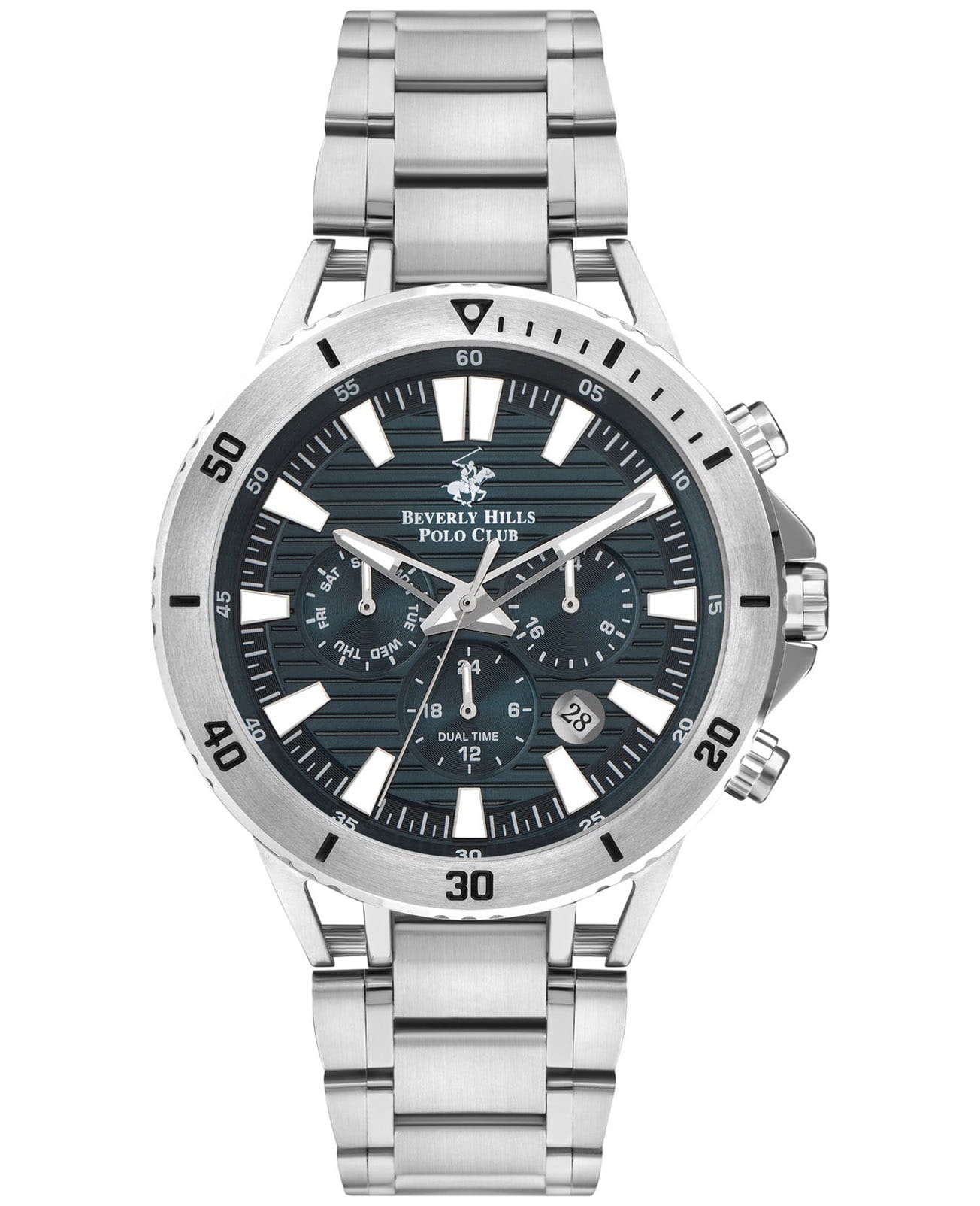 Американские мужские часы-хронографХронографФункция позволяет измерять отрезки времени с особой точностью: часы, минуты, секунды. Верным признаком хронографа является наличие на циферблате 3 дополнительных окошек-счётчиков. Beverly Hills Polo Club BP3401X.390 с минеральным стекломМинеральное стеклоМинеральное стекло представляет собой искусственно выращенный минерал кварца. Такое стекло отличается особой устойчивостью к повреждениям и царапинам. Уступает по некоторым качествам сапфировому стеклу., кварцевый механизм с высокой точностью. Класс водозащиты: 100 метров, позволит плавать, нырять и заниматься другими водными видами спорта. Браслет с раскладной застёжкойРаскладная застёжкаТакой тип застёжки используется только на браслетах из металла. Она никогда не раскрывается полностью, происходит разделение на 2 и более частей. Раскладывающая застёжка снизит вероятность потери часов к минимуму.. Окошко даты находится в положении между 4 и 5 часов.
