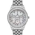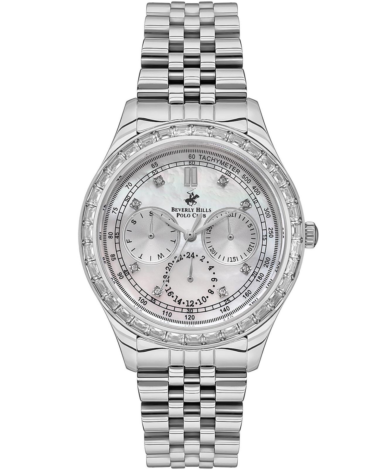 Американские женские часы с минеральным стекломМинеральное стеклоМинеральное стекло представляет собой искусственно выращенный минерал кварца. Такое стекло отличается особой устойчивостью к повреждениям и царапинам. Уступает по некоторым качествам сапфировому стеклу. Beverly Hills Polo Club BP3563X.320, кварцевый механизм с высокой точностью. Корпус часов изготовлен из нержавеющей стали. На циферблате расположены три дополнительных индикатора (24-х часовой формат времени, день недели и дата) и шкала тахиметрТахиметрРазмеченная шкала, располагается на ободке или безеле часов. Тахиметр позволяет рассчитать скорость на определённом участке пути, расстояние измеряется в километрах или милях.. Класс водозащиты: 50 метров, позволит защитить корпус от случайных брызг или капель дождя. Стальной браслет с частичным на застёжке бабочке. БезельБезельВнешний ободок, закрепляющий стекло. В спортивных часах так называется поворотное кольцо с делениями на циферблате, выполняет роль таймера – замеряет отрезки времени на шкале. Неподвижный безель – элемент декора. Однонаправленно вращающийся безель на дайверских часах позволяет фиксировать моменты погружения и выныривания на поверхность. и циферблат инкрустирован кристаллами.