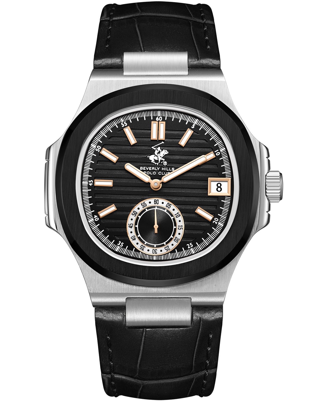 Американские мужские часы Beverly Hills Polo Club BP3792X.361 - это стильный мужской аксессуар, который сочетает элегантный дизайн и практичность. Корпус выполнен из нержавеющей стали серебристого цвета, диаметром 43,5 мм, что обеспечивает долговечность и утончённый внешний вид. Надежное минеральное стеклоМинеральное стеклоМинеральное стекло представляет собой искусственно выращенный минерал кварца. Такое стекло отличается особой устойчивостью к повреждениям и царапинам. Уступает по некоторым качествам сапфировому стеклу. с сапфировым покрытием защищает циферблат от царапин и обеспечивает долговечность. Модель оснащена кварцевым механизмом, обеспечивающим высокую точность хода. Неподвижный безельБезельВнешний ободок, закрепляющий стекло. В спортивных часах так называется поворотное кольцо с делениями на циферблате, выполняет роль таймера – замеряет отрезки времени на шкале. Неподвижный безель – элемент декора. Однонаправленно вращающийся безель на дайверских часах позволяет фиксировать моменты погружения и выныривания на поверхность. с IP-покрытиемIP-покрытиеМетод ионного напыления. Демонстрирует повышенную устойчивость к истиранию, окислению и химическим веществам. Под воздействием высокого давления и температуры около 1500°C молекулы металла надёжно соединяются с частицами корпуса часов. черного цвета. Кожаный ремешок на стандартной застежке обеспечивает комфортное ношение. Окошко даты находится в положении 3 часа. Стрелки и метки с люминесцентным покрытиемЛюминесцентное покрытиеПозволяет считывать показания времени в темноте. Производители наносят на стрелки, часовые индексы, безель или поверхность циферблата светонакопительный состав, дающий холодное свечение. позволяют легко считывать время даже в условиях недостаточного освещения. Водозащита 50 метров позволит защитить корпус от случайных брызг или капель дождя. Эта модель – отличный выбор для тех, кто ищет сочетание стиля, качества и функциональности. Часы станут не только полезным аксессуаром, но и выразительным элементом вашего имиджа.