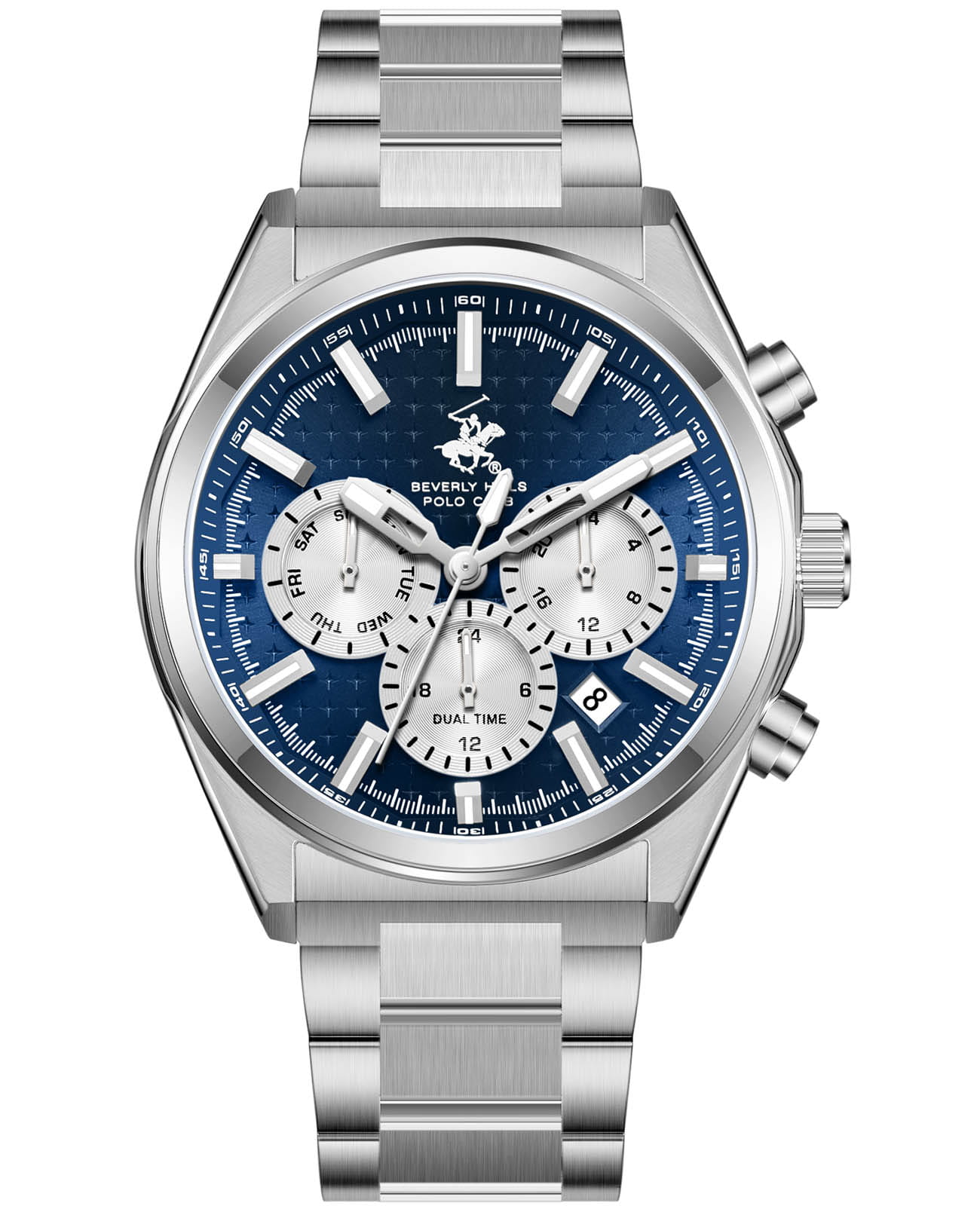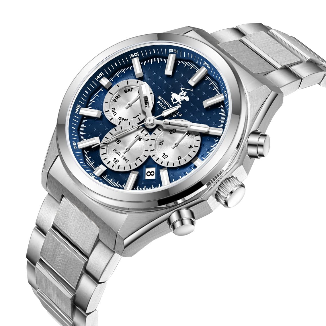 Мужские кварцевые часы Beverly Hills Polo Club — это стильный аксессуар из коллекции Summer 25. Корпус диаметром 42 мм выполнен из стали. Циферблат синего цвета оформлен линейными индексами. Указатели дня недели, даты и 24-часового формата времени вынесены на отдельные субциферблаты. Циферблат защищён минеральным стекломМинеральное стеклоМинеральное стекло представляет собой искусственно выращенный минерал кварца. Такое стекло отличается особой устойчивостью к повреждениям и царапинам. Уступает по некоторым качествам сапфировому стеклу.. Часы оснащены стальным браслетом с застёжкой «бабочка» с кнопкамиЗастёжка "бабочка"Такой вид застёжки дополняется предохранителями, помогающими избежать случайного раскрытия браслета. Обладают изящным исполнением. . Водонепроницаемость 50 м позволяет использовать часы в повседневных условиях. Идеальный выбор для тех, кто ценит модный дизайн и надёжность.