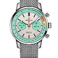 Breitling Top Time B01 Fausto Coppi AB01768A1A1A1 — лимитированные часы, вдохновлённые легендой велоспорта Фаусто Коппи и эстетикой ретро-хронографов 60-х годов. Корпус диаметром 41 мм выполнен из нержавеющей стали с комбинированной сатинированной и полированной отделкой. Прозрачная задняя крышка с гравировкой «Fausto Coppi Tribute» и «One of 750» подчёркивает уникальность выпуска. Циферблат защищён сапфировым стекломСапфировое стеклоПрочный и надёжный материал из кристалла сапфира синтетического происхождения, характеризующийся особой твёрдостью и устойчивостью к царапинам и повреждениям. с антибликовым покрытиемАнтибликовое покрытиеСлой оксида металла в 0,13-0,3 микрон, благодаря которому стекло часов не бликует и не отражает свет. Антибликовое покрытие уменьшает отражение света в 10 раз, обеспечивая отличную читаемость показателей циферблата.. Белый матовый циферблат украшен бирюзовыми субциферблатами и надписью «Il Campionissimo» по внешнему кругу. Подпись Fausto Coppi расположена на отметке 6 часов. Внутри установлен швейцарский автоматический калибр COSC-сертифицированныйСертификат COSCОфициальный сертификат, подтверждающий то, что часы ходят с особо высокой точностью. Для получения документа часы подвергаются тестовым испытаниям, разработанным швейцарским институтом тестирования хронометров COSC. Допустимая норма для механических часов -4/+6 секунд в день, для кварцевых моделей +/- 0,07 секунд в день. хронографХронографФункция позволяет измерять отрезки времени с особой точностью: часы, минуты, секунды. Верным признаком хронографа является наличие на циферблате 3 дополнительных окошек-счётчиков. Breitling B01, обеспечивающий точность, стабильность и запас хода до 70 часов. Модель укомплектована браслетом миланского плетения на застёжке «бабочка» с кнопкамиЗастёжка "бабочка"Такой вид застёжки дополняется предохранителями, помогающими избежать случайного раскрытия браслета. Обладают изящным исполнением. . Водонепроницаемость 100 метров делает часы надёжными не только в городе, но и в активной среде. Эта лимитированная модель — признание в любви к велоспорту и винтажной эстетике.