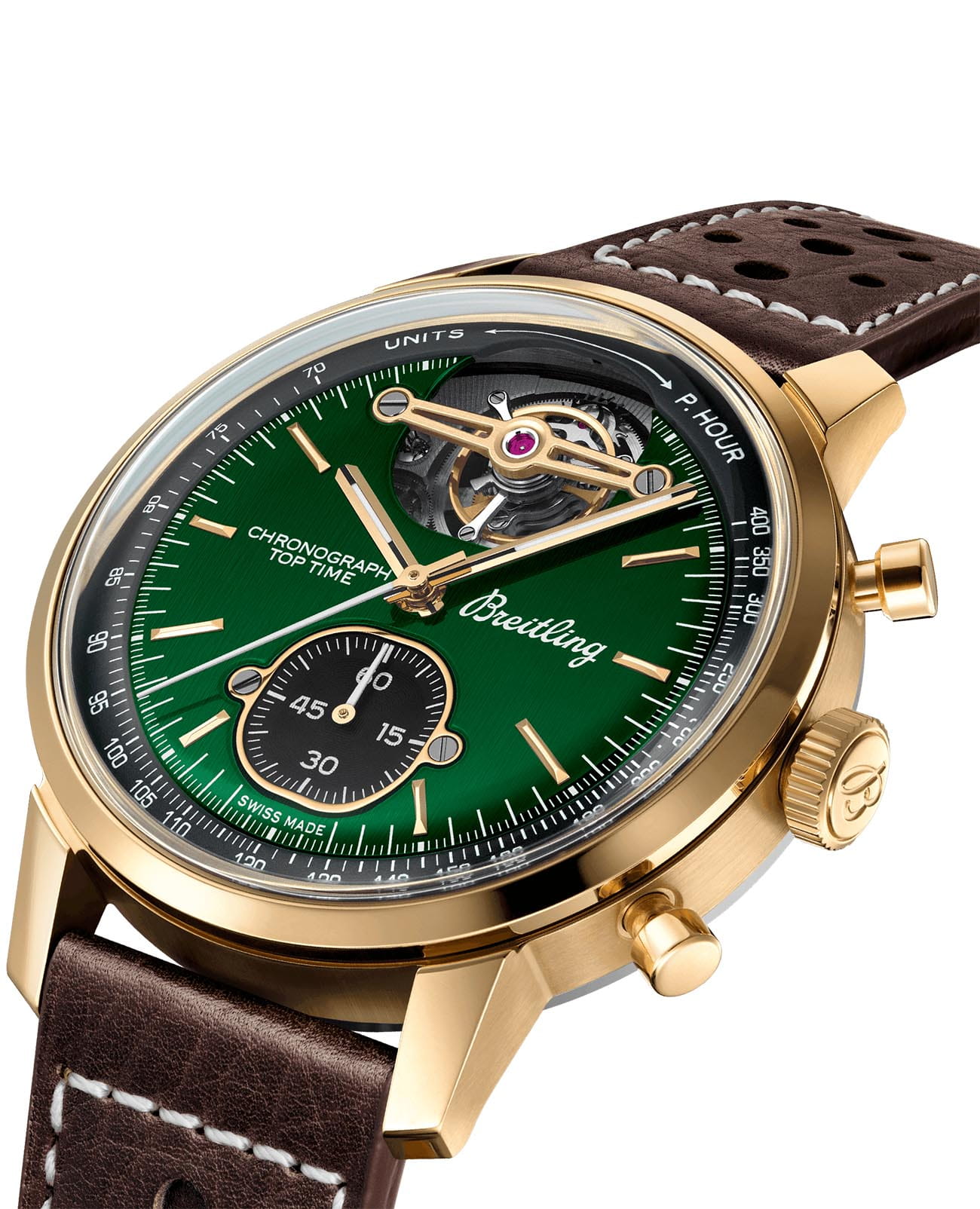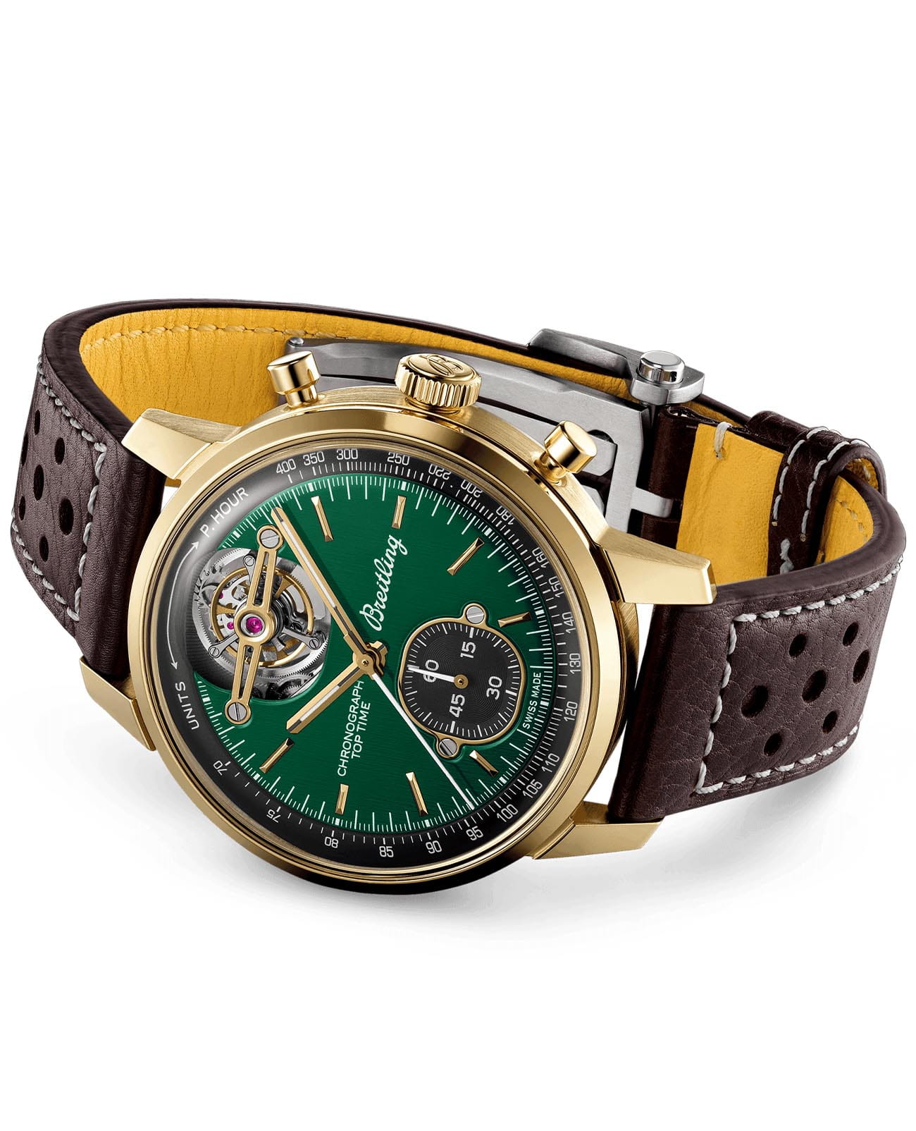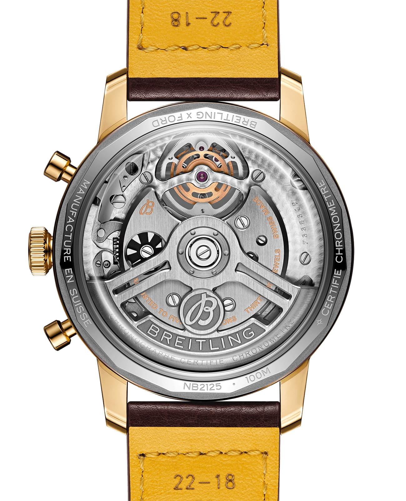 Мужские наручные часы c хронографомХронографФункция позволяет измерять отрезки времени с особой точностью: часы, минуты, секунды. Верным признаком хронографа является наличие на циферблате 3 дополнительных окошек-счётчиков. Breitling Top Time B21 Ford Mustang NB21251A1L1X1, надежный автоматический механизм. Корпус часов изготовлен из бронзы. Практичный кожаный ремешок на стандартной застёжке. ТахиметрТахиметрРазмеченная шкала, располагается на ободке или безеле часов. Тахиметр позволяет рассчитать скорость на определённом участке пути, расстояние измеряется в километрах или милях., сапфировое стеклоСапфировое стеклоПрочный и надёжный материал из кристалла сапфира синтетического происхождения, характеризующийся особой твёрдостью и устойчивостью к царапинам и повреждениям. повышенной прозрачности, устойчивое к мелким механическим повреждениям. Стрелки и метки с люминесцентным покрытиемЛюминесцентное покрытиеПозволяет считывать показания времени в темноте. Производители наносят на стрелки, часовые индексы, безель или поверхность циферблата светонакопительный состав, дающий холодное свечение..