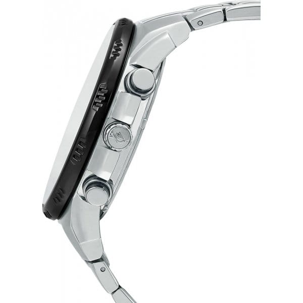 Массивная модель выполнена в автомобильной стилистике, благодаря внушительному ударопрочному корпусуУдаропрочный корпусМеханизм заключён в корпус, выполненный из современных материалов, устойчивых к ударам, механическим повреждениям и падению с высоты: инновационный пластик, карбон, нержавеющая сталь, титан. она отлично смотрится на широком мужском запястье. Чёрно-серебристая расцветка всегда останется актуальной. Японский высокоточный кварцевый калибр. Продолжительный срок службы батарейки - 5 лет. Электролюминесцентная подсветкаЭлектролюминесцентная подсветкаЭлектролюминесцентная панель устанавливается под ЖК-экраном часов, при нажатии кнопки электричество преобразуется в свет за счёт подачи напряжения на атомы фосфора, такой тип подсветки позволяет освещать весь циферблат.. Минеральное стекло. Водостойкость до 10 бар. БезельБезельВнешний ободок, закрепляющий стекло. В спортивных часах так называется поворотное кольцо с делениями на циферблате, выполняет роль таймера – замеряет отрезки времени на шкале. Неподвижный безель – элемент декора. Однонаправленно вращающийся безель на дайверских часах позволяет фиксировать моменты погружения и выныривания на поверхность. с IP-покрытиемIP-покрытиеМетод ионного напыления. Демонстрирует повышенную устойчивость к истиранию, окислению и химическим веществам. Под воздействием высокого давления и температуры около 1500°C молекулы металла надёжно соединяются с частицами корпуса часов.. Нержавеющая сталь 316L. Отображение числа и дня недели, хронографХронографФункция позволяет измерять отрезки времени с особой точностью: часы, минуты, секунды. Верным признаком хронографа является наличие на циферблате 3 дополнительных окошек-счётчиков., секундомер, тахиметрТахиметрРазмеченная шкала, располагается на ободке или безеле часов. Тахиметр позволяет рассчитать скорость на определённом участке пути, расстояние измеряется в километрах или милях.. Габариты: 56,9 x 50,3 x 12,9 мм.