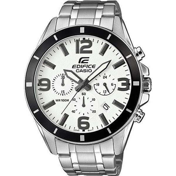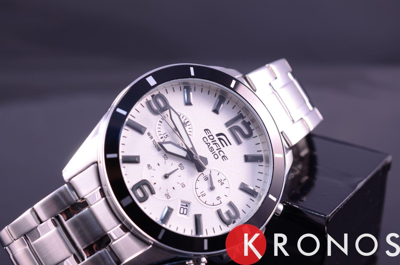 Стильный, мужские наручные часы Casio Edifice надежные и практичные. Кварцевый японский механизм Miyota. Точность хода не хуже -10 +15 сек./в месяц. Часы оснащены функцией хронографа, с точностью 1/10с и временем измерения 1ч. Циферблат белого цвета с контрастными элементами дизайна.  Стрелки и индексы с светонакопительным нанесением. Корпус и браслет выполнены из нержавеющей стали. Безель с IP покрытием черного цвета. Минеральное стекло устойчиво к появлению царапин. Водонепроницаемость 100М. В часах можно плавать. Степень водонепроницаемости не является величиной, эквивалентной функциональной рабочей глубине.