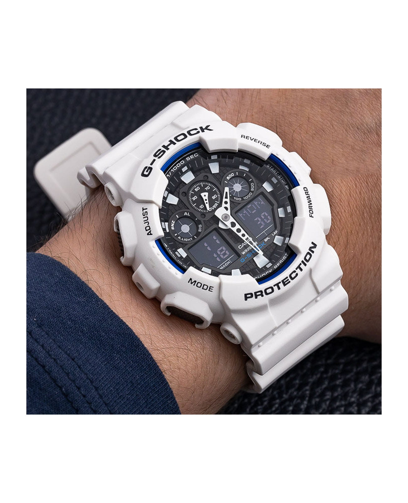 Японские мужские часы-хронографХронографФункция позволяет измерять отрезки времени с особой точностью: часы, минуты, секунды. Верным признаком хронографа является наличие на циферблате 3 дополнительных окошек-счётчиков. Casio G-Shock GA-100B-7A из коллекции G-Shock. Противоударный пластиковый корпус с карбоновыми волокнами более прочный и, в то же время, более легкий. Минеральное стеклоМинеральное стеклоМинеральное стекло представляет собой искусственно выращенный минерал кварца. Такое стекло отличается особой устойчивостью к повреждениям и царапинам. Уступает по некоторым качествам сапфировому стеклу. устойчивое к появлению царапин, обладающее высокой прозрачностью. Ударопрочный корпусУдаропрочный корпусМеханизм заключён в корпус, выполненный из современных материалов, устойчивых к ударам, механическим повреждениям и падению с высоты: инновационный пластик, карбон, нержавеющая сталь, титан. защищает механизм от ударов и вибрации. Многокомпонентный циферблат состоит из цифровых окошек указателей числа и дня недели, а также индикатора режима работы часов, который расположен в позиции 9 часов и выполнен в виде пропеллера. Светодиодная подсветкаСветодиодная подсветкаСветодиодная или LED-подсветка обеспечивает появление яркого холодного свечения за счёт LED-элементов - маленьких лампочек. Они потребляют минимальное количество энергии, чаще всего можно встретить 1 светодиод, в нижней части циферблата. освещает весь циферблат. Мировое времяМировое время Полезное часовое усложнение, отображающее время в основных городах и известных областях по всему миру, оно связано с часовыми поясами, удобно для путешественников и бизнесменов. – 48 городов (29 часовых поясов). СекундомерСекундомерСекундоме́р — прибор, способный измерять интервалы времени с точностью до долей секунды. с точностью измерения 1/100 секунды и измерением до 23 часов 59 минут 59,99 cек. ТаймерТаймерОтсчитывает секунды в обратном направлении в заданном интервале времени. обратного отсчета (диапазон времени 24 часа), автоматический календарь, 12/24 отображение времени. 5 будильниковБудильникБуди́льник — часы, в заданный момент времени подающие звуковой, световой и/или в редких случаях другой сигнал., ежечасный сигнал. Класс водозащиты: 200 метров, позволит плавать, нырять и заниматься другими водными видами спорта. Ремешок из полимерного материала на стандартной застежке.