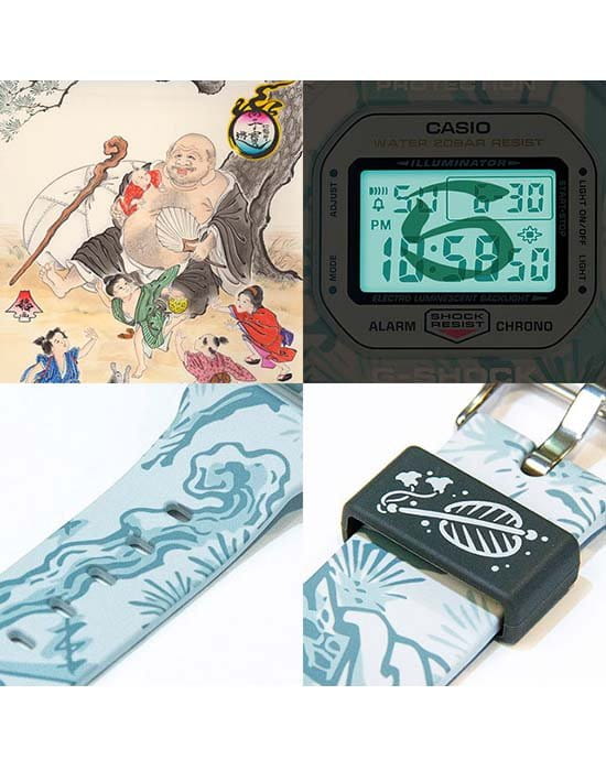 Перед вами редчайшая модель G-Shock в корпусе DW-5600 Часы выполнены в зеленом цвете, художественные элементы украшают корпус, ремешок и держатель ремешка Напомним, что модель является одной из 7 моделей в лимитированной серии "The G-Shock Seven Lucky Gods", посвященной различным азиатским божествам