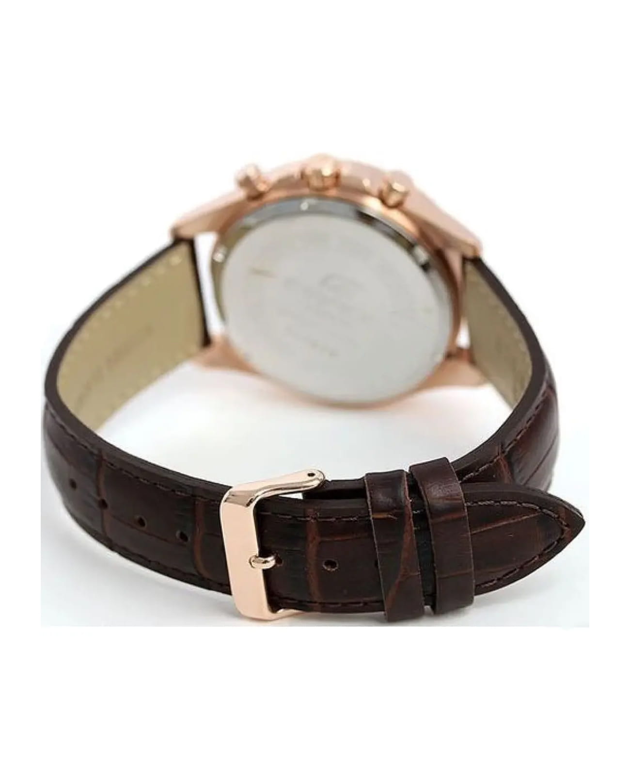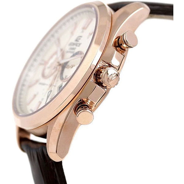 Мужские часы-хронографХронографФункция позволяет измерять отрезки времени с особой точностью: часы, минуты, секунды. Верным признаком хронографа является наличие на циферблате 3 дополнительных окошек-счётчиков.  Casio Edifice EFB-504JGL-7A, кварцевый механизм с высокой точностью. Минеральное стеклоМинеральное стеклоМинеральное стекло представляет собой искусственно выращенный минерал кварца. Такое стекло отличается особой устойчивостью к повреждениям и царапинам. Уступает по некоторым качествам сапфировому стеклу. устойчивое к появлению царапин, обладающее высокой прозрачностью. СекундомерСекундомерСекундоме́р — прибор, способный измерять интервалы времени с точностью до долей секунды. с точностью показаний 1/10с и временем измерения 1ч. Корпус изготовлен из нержавеющей стали. БезельБезельВнешний ободок, закрепляющий стекло. В спортивных часах так называется поворотное кольцо с делениями на циферблате, выполняет роль таймера – замеряет отрезки времени на шкале. Неподвижный безель – элемент декора. Однонаправленно вращающийся безель на дайверских часах позволяет фиксировать моменты погружения и выныривания на поверхность. изготовлен из стали с IP-покрытиемIP-покрытиеМетод ионного напыления. Демонстрирует повышенную устойчивость к истиранию, окислению и химическим веществам. Под воздействием высокого давления и температуры около 1500°C молекулы металла надёжно соединяются с частицами корпуса часов.. Стрелки и метки с люминесцентным покрытиемЛюминесцентное покрытиеПозволяет считывать показания времени в темноте. Производители наносят на стрелки, часовые индексы, безель или поверхность циферблата светонакопительный состав, дающий холодное свечение.. Окошко даты находится между метками 4 и 5 часов. Класс водозащиты: 100 метров, позволит плавать, нырять и заниматься другими водными видами спорта. Заводная головка с защитой. Кожаный ремешок на стандартной застежке.
