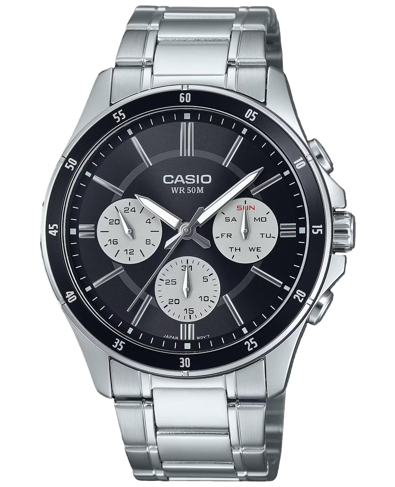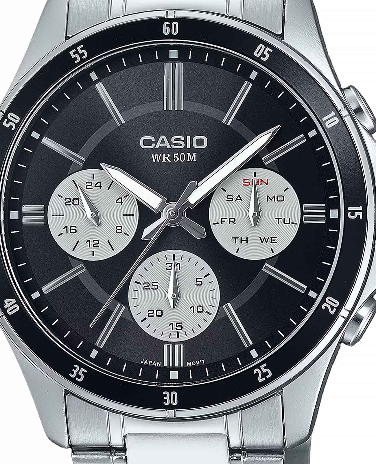 Японские мужские наручные часы с минеральным стекломМинеральное стеклоМинеральное стекло представляет собой искусственно выращенный минерал кварца. Такое стекло отличается особой устойчивостью к повреждениям и царапинам. Уступает по некоторым качествам сапфировому стеклу. MTP-1374D-1A3V, кварцевый механизм с высокой точностью. Класс водозащиты: 50 метров, позволит защитить корпус от случайных брызг или капель дождя. Корпус часов изготовлен из стали. Стальной браслет на раскладной застёжкеРаскладная застёжкаТакой тип застёжки используется только на браслетах из металла. Она никогда не раскрывается полностью, происходит разделение на 2 и более частей. Раскладывающая застёжка снизит вероятность потери часов к минимуму.. Стрелки с люминесцентным покрытиемЛюминесцентное покрытиеПозволяет считывать показания времени в темноте. Производители наносят на стрелки, часовые индексы, безель или поверхность циферблата светонакопительный состав, дающий холодное свечение.. 12-ти и 24-х часовой формат времени, число и день недели вынесены на отдельные циферблаты. Метки в виде штрихов. Заводная головка с защитой. БезельБезельВнешний ободок, закрепляющий стекло. В спортивных часах так называется поворотное кольцо с делениями на циферблате, выполняет роль таймера – замеряет отрезки времени на шкале. Неподвижный безель – элемент декора. Однонаправленно вращающийся безель на дайверских часах позволяет фиксировать моменты погружения и выныривания на поверхность. с IP-покрытиемIP-покрытиеМетод ионного напыления. Демонстрирует повышенную устойчивость к истиранию, окислению и химическим веществам. Под воздействием высокого давления и температуры около 1500°C молекулы металла надёжно соединяются с частицами корпуса часов..