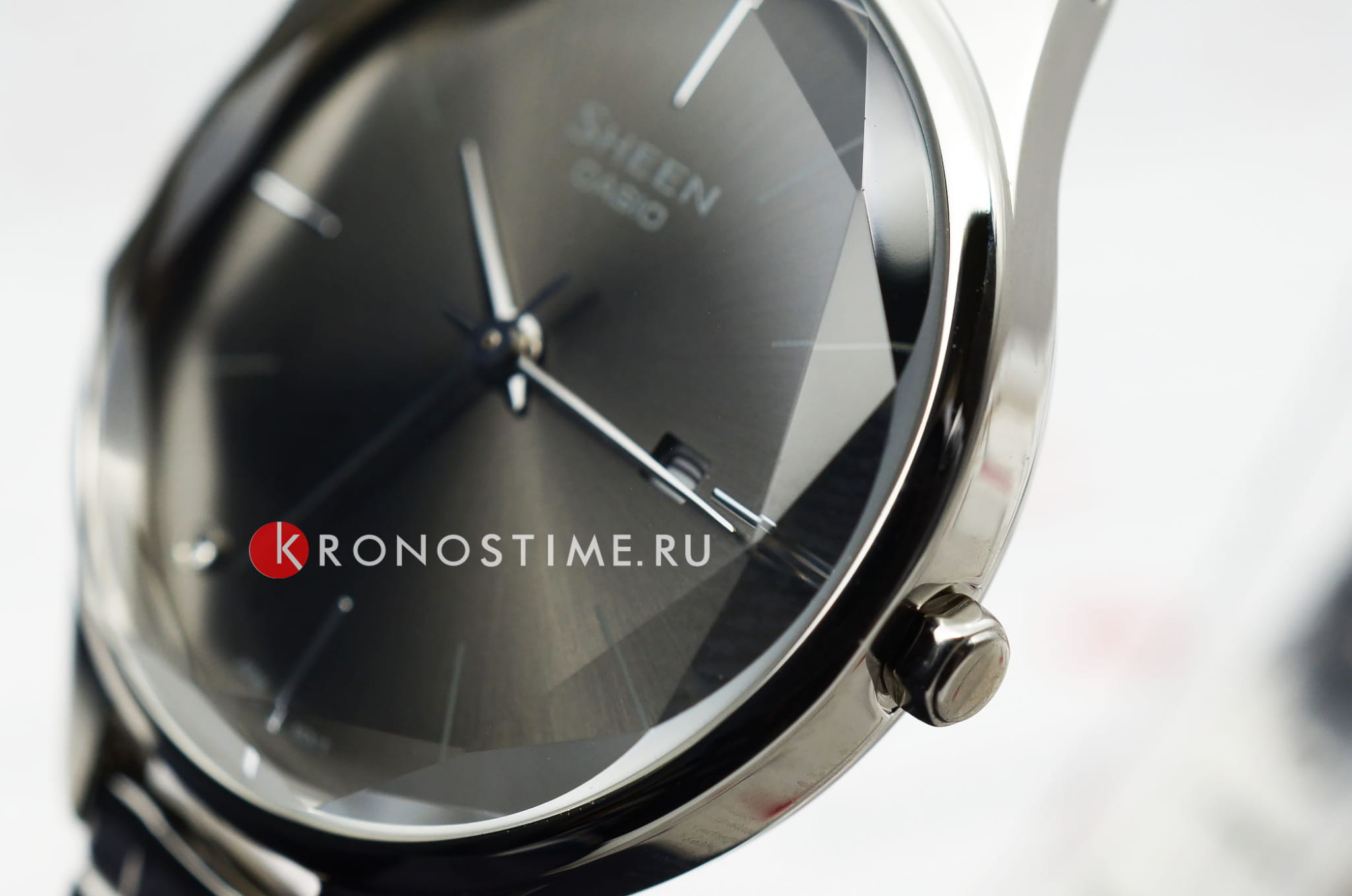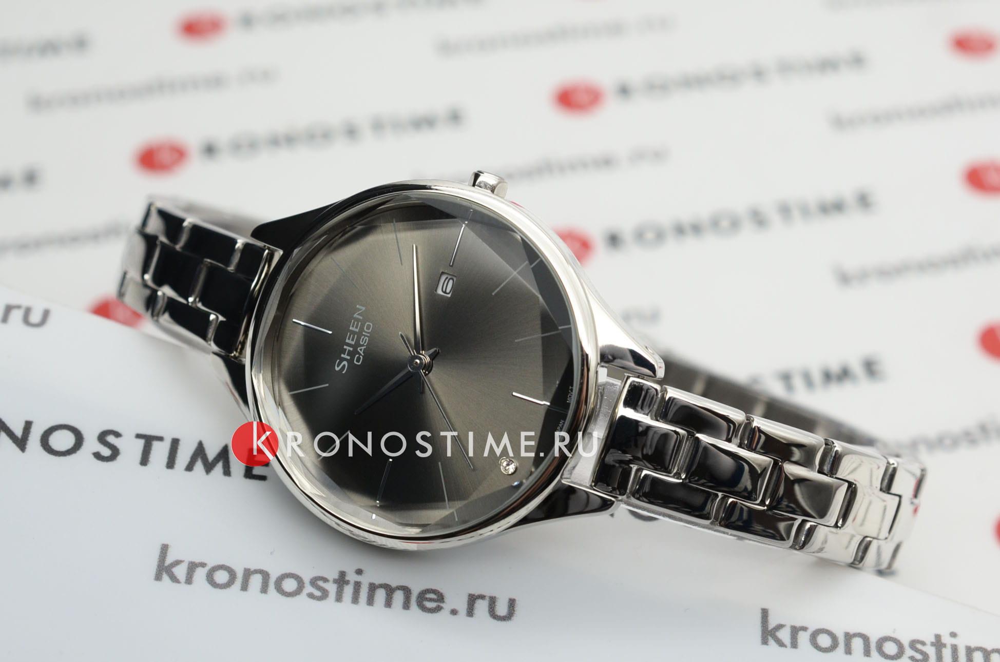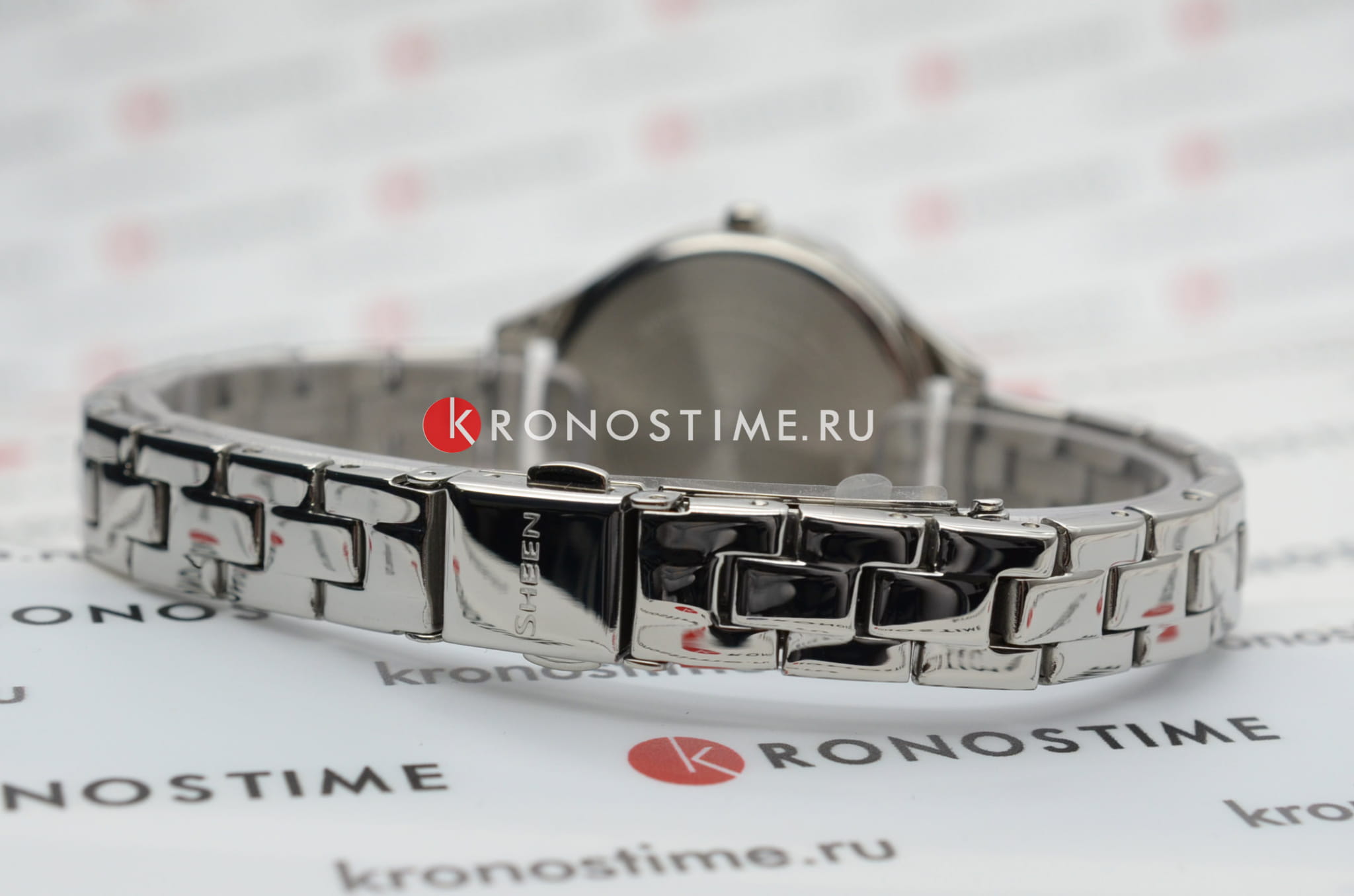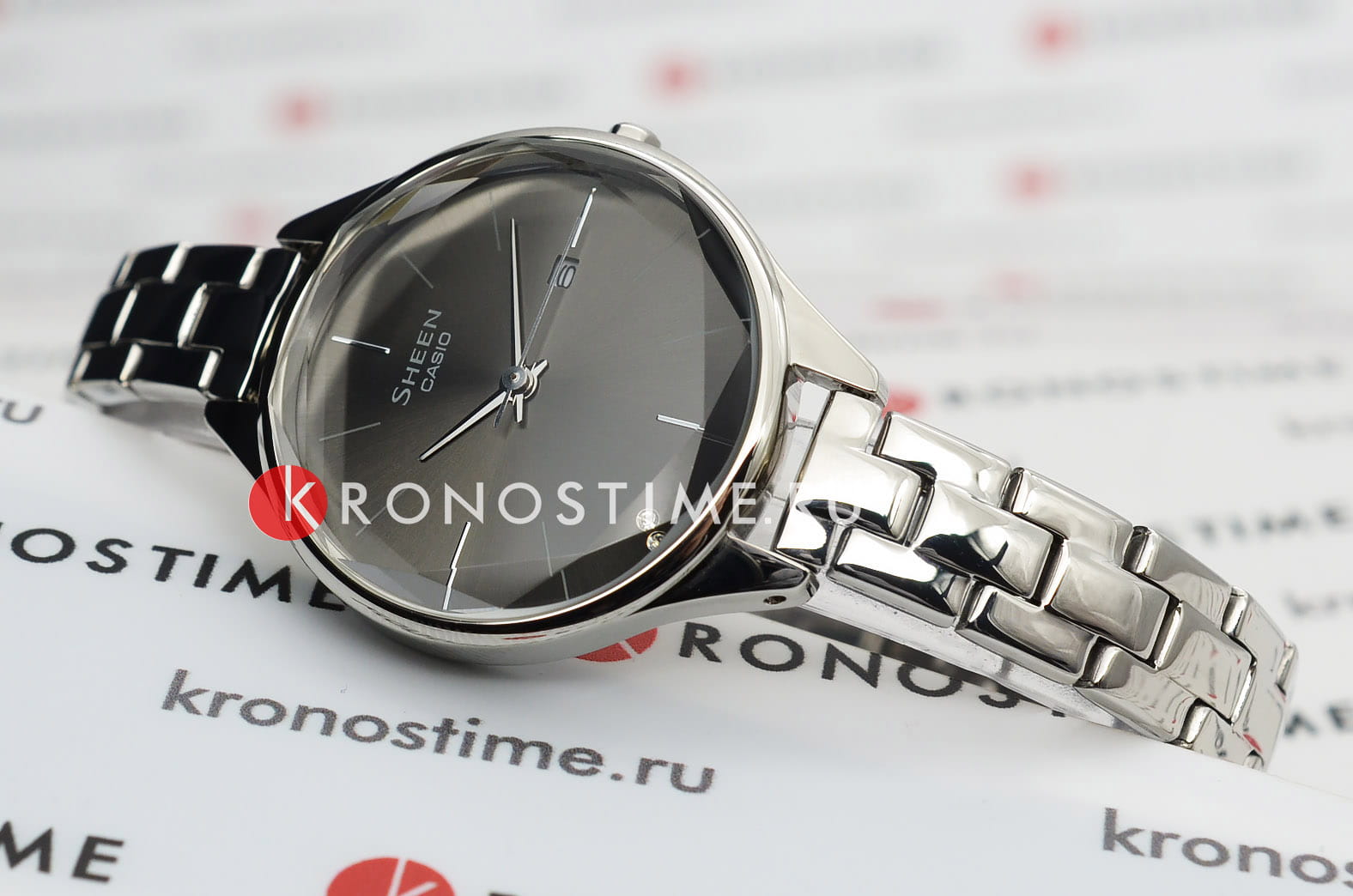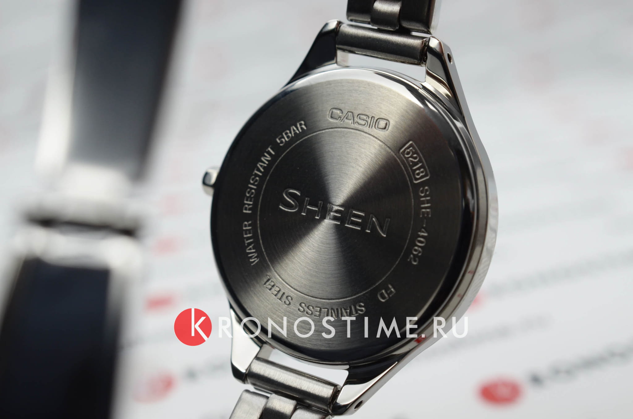 Женские японские наручные часы с минеральным стекломМинеральное стеклоМинеральное стекло представляет собой искусственно выращенный минерал кварца. Такое стекло отличается особой устойчивостью к повреждениям и царапинам. Уступает по некоторым качествам сапфировому стеклу. Casio Sheen SHE-4062D-8A, кварцевый механизм с высокой точностью. Класс водозащиты: 50 метров, позволит защитить корпус от случайных брызг или капель дождя. Корпус часов изготовлен из стали, серебристого цвета. Циферблат часов, украшенный кристаллом, защищен изящным граненым стеклом. Браслет с раскладной застёжкойРаскладная застёжкаТакой тип застёжки используется только на браслетах из металла. Она никогда не раскрывается полностью, происходит разделение на 2 и более частей. Раскладывающая застёжка снизит вероятность потери часов к минимуму.
