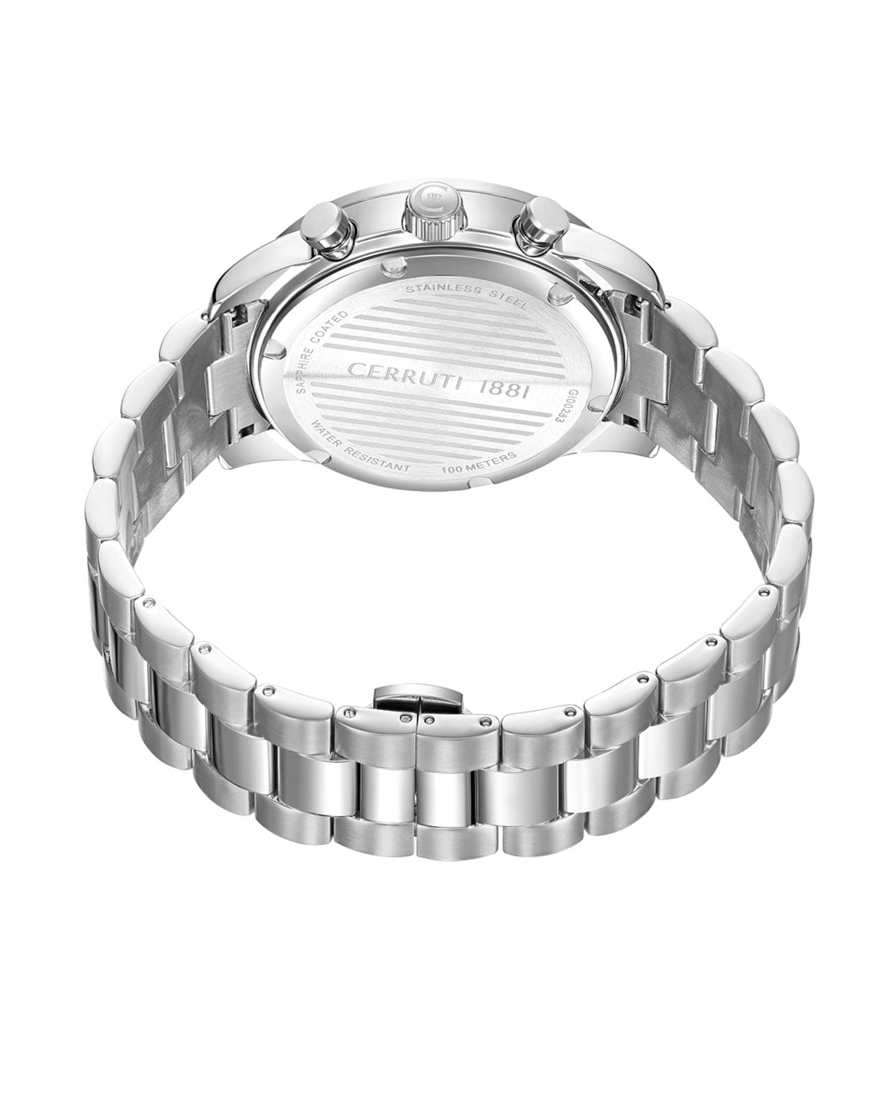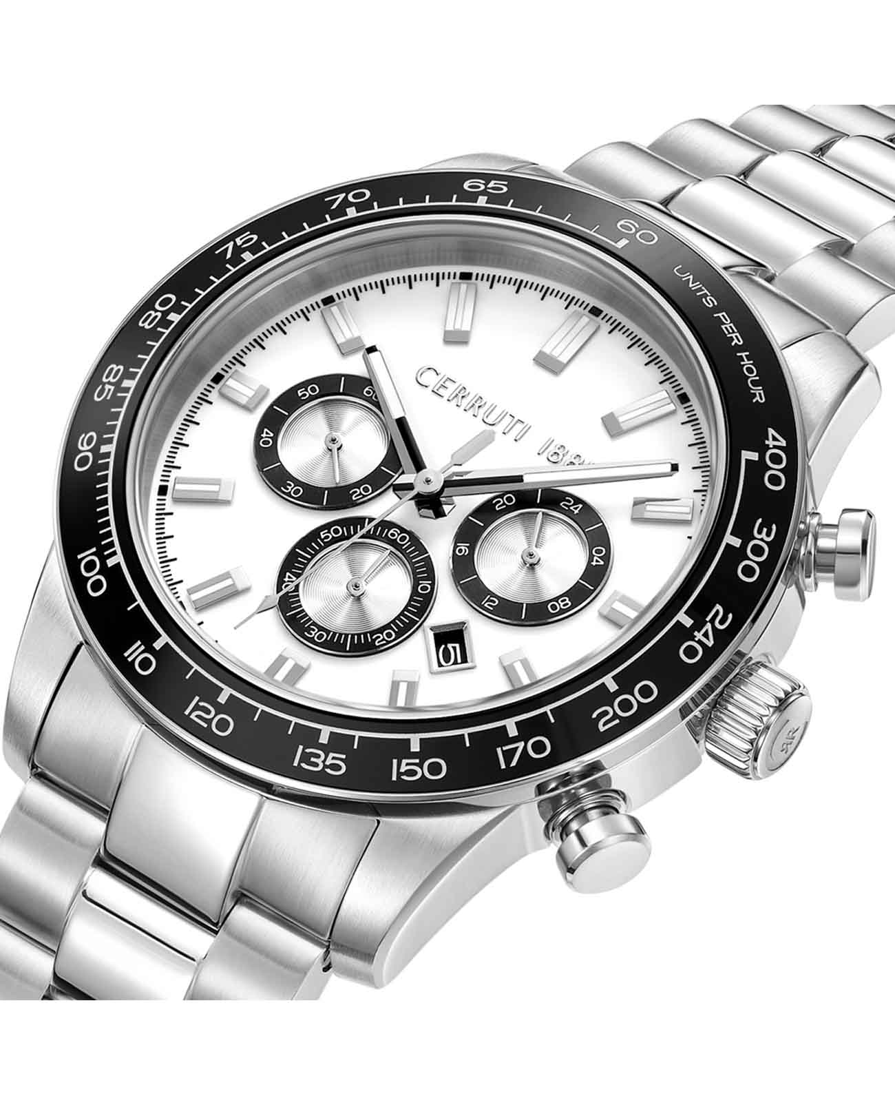 Французские мужские часы-хронографХронографФункция позволяет измерять отрезки времени с особой точностью: часы, минуты, секунды. Верным признаком хронографа является наличие на циферблате 3 дополнительных окошек-счётчиков. Cerruti 1881 Turchino CIWGI0028302, кварцевый механизм с высокой точностью. Минеральное стеклоМинеральное стеклоМинеральное стекло представляет собой искусственно выращенный минерал кварца. Такое стекло отличается особой устойчивостью к повреждениям и царапинам. Уступает по некоторым качествам сапфировому стеклу. устойчивое к мелким механическим повреждениям. Корпус часов изготовлен из стали. БезельБезельВнешний ободок, закрепляющий стекло. В спортивных часах так называется поворотное кольцо с делениями на циферблате, выполняет роль таймера – замеряет отрезки времени на шкале. Неподвижный безель – элемент декора. Однонаправленно вращающийся безель на дайверских часах позволяет фиксировать моменты погружения и выныривания на поверхность. из нержавеющей стали и кермики. Циферблат выполнен с метками в виде штрихов. Окошко даты находится в положении между 4 и 5 часами. Стрелки и метки с люминесцентным покрытиемЛюминесцентное покрытиеПозволяет считывать показания времени в темноте. Производители наносят на стрелки, часовые индексы, безель или поверхность циферблата светонакопительный состав, дающий холодное свечение.. Класс водозащиты: 100 метров, позволит плавать, нырять и заниматься другими водными видами спорта. Стальной на застёжке-бабочке с кнопкамиЗастёжка "бабочка"Такой вид застёжки дополняется предохранителями, помогающими избежать случайного раскрытия браслета. Обладают изящным исполнением. .