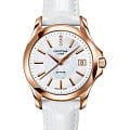 Вместо метки 12 часов использованы бриллианты оттенка Top Wesselton. Стальной корпус с PVD-покрытиемPVDУльтратонкое покрытие наносится в технике вакуумного напыления, сочетает в себе нитрид титана особой прочности со слоем золота или оксида хрома. Несёт в себе декоративную или защитную функцию. основан на концепции Двойной надёжности DS ConceptDS ConceptDouble Security Concept, обозначает двойную надёжность и безупречную точность часов Certina. Двойная система защиты подразумевает обеспечение максимальной устойчивости к ударам и высоких показателей водонепроницаемости.. Часы оснащены кварцевым швейцарским калибром ETA F05.111. Белый ремешок выполнен из натуральной кожи.