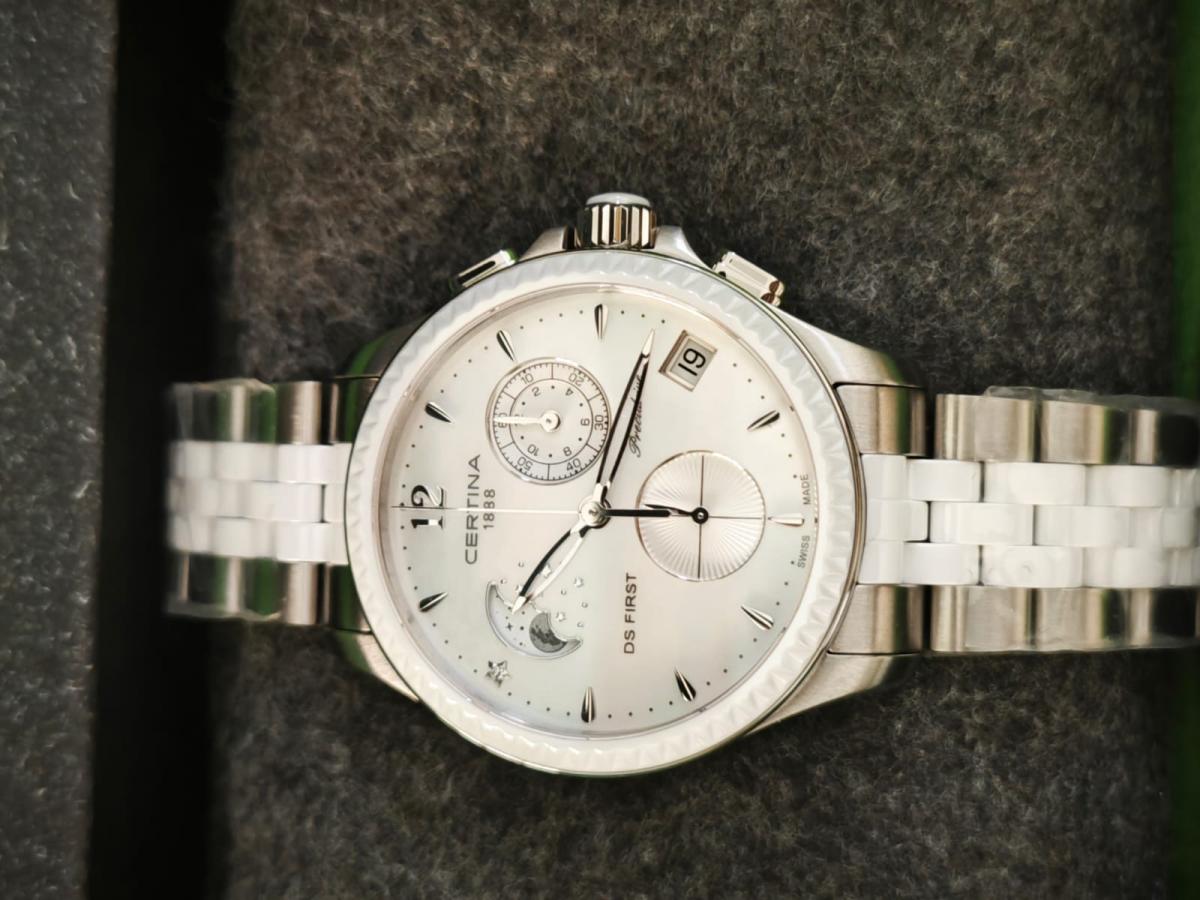 Окошко на позиции 10 часов отображает лунные фазы, стильно смотрится бриллиантовая звезда. Кварцевый швейцарский механизм G10.962 Precidrive™Precidrive™Инновационный кварцевый механизм Certina. Часы, оснащённые этим швейцарским калибром, приравниваются к точности к сертифицированным хронометрам, точность хода составляет +/-10 секунд в год.. Керамический безельБезельВнешний ободок, закрепляющий стекло. В спортивных часах так называется поворотное кольцо с делениями на циферблате, выполняет роль таймера – замеряет отрезки времени на шкале. Неподвижный безель – элемент декора. Однонаправленно вращающийся безель на дайверских часах позволяет фиксировать моменты погружения и выныривания на поверхность.. Стальной браслет с керамическими вставками. EOLEOLПредставляет собой систему, уведомляющую владельца часов о необходимости замены элемента питания. За 2 недели до полного разряда батарейки секундная стрелка перестаёт ходить чётко и начинает перепрыгивать на 3-4 деления., календарь, хронографХронографФункция позволяет измерять отрезки времени с особой точностью: часы, минуты, секунды. Верным признаком хронографа является наличие на циферблате 3 дополнительных окошек-счётчиков..