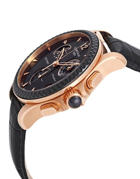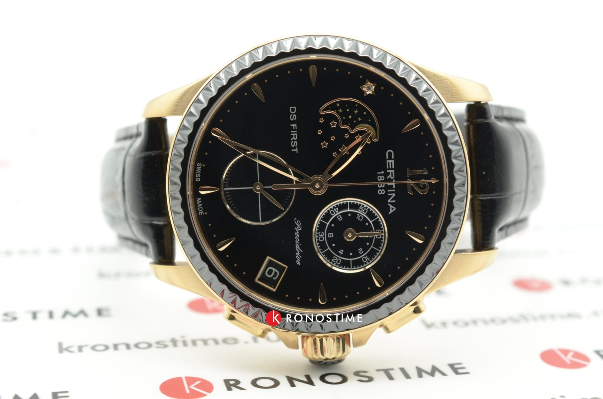 Женские швейцарские часы Certina DS First Lady Chronograph Moon Phase C030.250.36.056.00 из коллекции DS First привлекают эксклюзивным дизайном. Окошко в положении 10 часов отображает лунные фазы, стильно смотрится бриллиантовая звезда. Кварцевый швейцарский механизм G10.962 Precidrive™. Керамический безель с гранёным краем. Чёрный кожаный ремешок. EOL, календарь, хронограф. Производство и сборка: Швейцария.