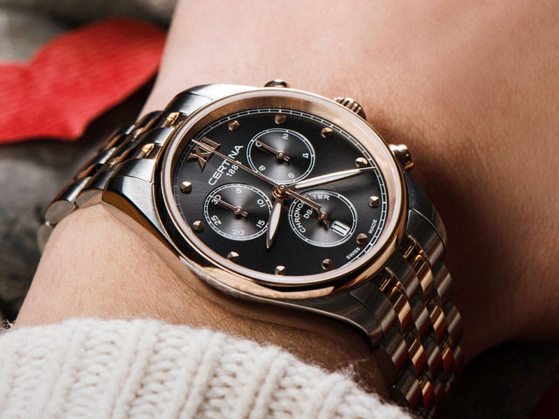 Женские швейцарские часы Certina DS-8 Lady Chronograph C033.234.11.118.00 из коллекции DS-8 – идеальное украшение образа. Модель имеет высокую точность хода швейцарского кварцевого калибра ETA G15.212 Precidrive™Precidrive™Инновационный кварцевый механизм Certina. Часы, оснащённые этим швейцарским калибром, приравниваются к точности к сертифицированным хронометрам, точность хода составляет +/-10 секунд в год.. Это подтверждается сертификатом COSCСертификат COSCОфициальный сертификат, подтверждающий то, что часы ходят с особо высокой точностью. Для получения документа часы подвергаются тестовым испытаниям, разработанным швейцарским институтом тестирования хронометров COSC. Допустимая норма для механических часов -4/+6 секунд в день, для кварцевых моделей +/- 0,07 секунд в день.. Система Двойной Надёжности DSDS ConceptDouble Security Concept, обозначает двойную надёжность и безупречную точность часов Certina. Двойная система защиты подразумевает обеспечение максимальной устойчивости к ударам и высоких показателей водонепроницаемости.. Сапфировое стеклоСапфировое стеклоПрочный и надёжный материал из кристалла сапфира синтетического происхождения, характеризующийся особой твёрдостью и устойчивостью к царапинам и повреждениям. с обработкой «антиблик». ХронографХронографФункция позволяет измерять отрезки времени с особой точностью: часы, минуты, секунды. Верным признаком хронографа является наличие на циферблате 3 дополнительных окошек-счётчиков., секундомер, дата, EOLEOLПредставляет собой систему, уведомляющую владельца часов о необходимости замены элемента питания. За 2 недели до полного разряда батарейки секундная стрелка перестаёт ходить чётко и начинает перепрыгивать на 3-4 деления.. Частичное PVD-покрытиеPVDУльтратонкое покрытие наносится в технике вакуумного напыления, сочетает в себе нитрид титана особой прочности со слоем золота или оксида хрома. Несёт в себе декоративную или защитную функцию.. Производство и сборка: Швейцария.