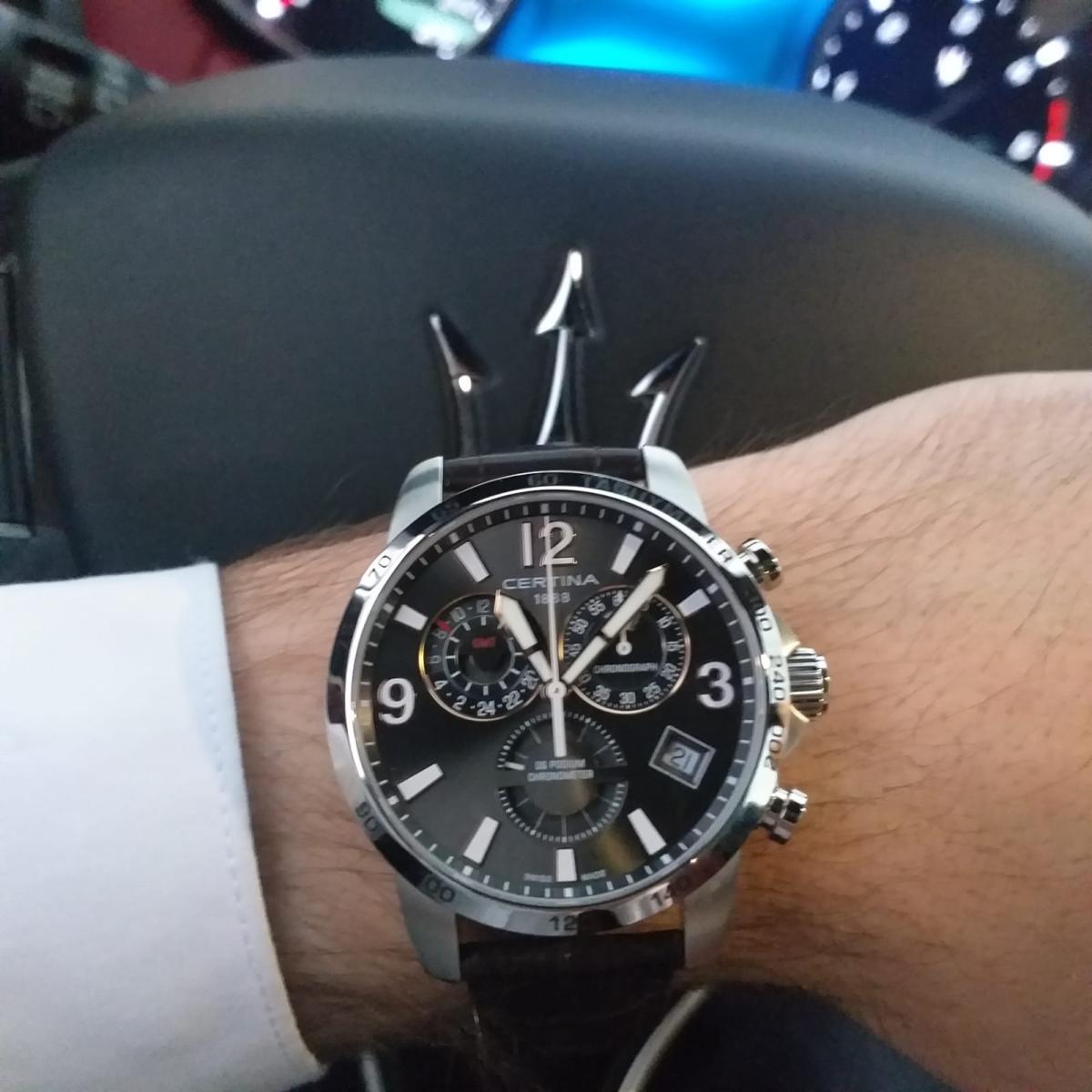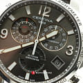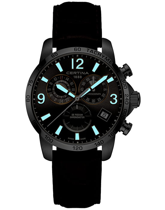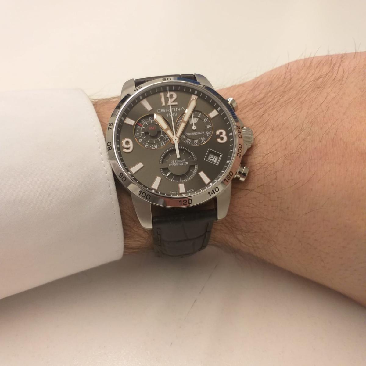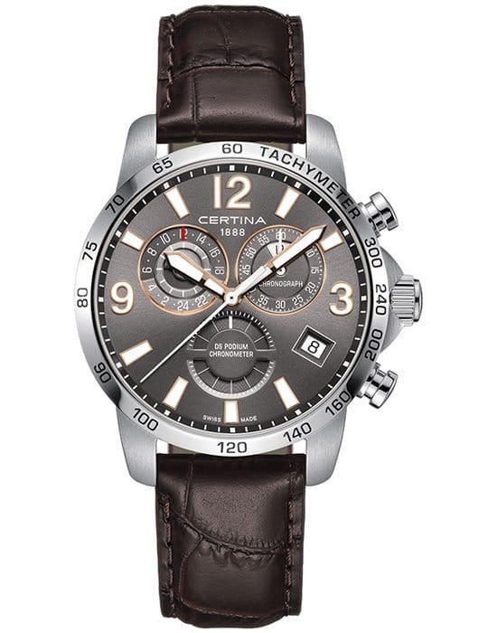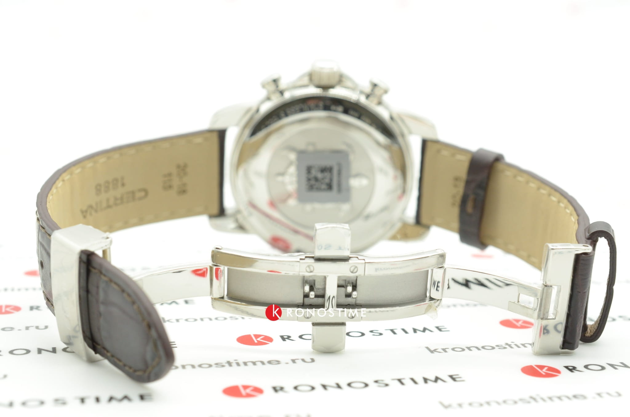 Аксессуар станет универсальным вариантом для делового или повседневного образа. Стильный хронографХронографФункция позволяет измерять отрезки времени с особой точностью: часы, минуты, секунды. Верным признаком хронографа является наличие на циферблате 3 дополнительных окошек-счётчиков. функционирует благодаря швейцарскому кварцевому механизму ETA G10.962 Precidrive™Precidrive™Инновационный кварцевый механизм Certina. Часы, оснащённые этим швейцарским калибром, приравниваются к точности к сертифицированным хронометрам, точность хода составляет +/-10 секунд в год.. Его абсолютная точность хода отмечена официальным сертификатом хронометра COSCСертификат COSCОфициальный сертификат, подтверждающий то, что часы ходят с особо высокой точностью. Для получения документа часы подвергаются тестовым испытаниям, разработанным швейцарским институтом тестирования хронометров COSC. Допустимая норма для механических часов -4/+6 секунд в день, для кварцевых моделей +/- 0,07 секунд в день.. Классический ремешок из натуральной кожи имеет поверхность с тиснением под кожу крокодила. Соблюдение DS ConceptDS ConceptDouble Security Concept, обозначает двойную надёжность и безупречную точность часов Certina. Двойная система защиты подразумевает обеспечение максимальной устойчивости к ударам и высоких показателей водонепроницаемости.. Сапфировое стекло с односторонним антибликовым покрытием. БезельБезельВнешний ободок, закрепляющий стекло. В спортивных часах так называется поворотное кольцо с делениями на циферблате, выполняет роль таймера – замеряет отрезки времени на шкале. Неподвижный безель – элемент декора. Однонаправленно вращающийся безель на дайверских часах позволяет фиксировать моменты погружения и выныривания на поверхность. со шкалой тахиметраТахиметрРазмеченная шкала, располагается на ободке или безеле часов. Тахиметр позволяет рассчитать скорость на определённом участке пути, расстояние измеряется в километрах или милях.. Водостойкость 100 метров. Люминесцентная подсветкаЛюминесцентное покрытиеПозволяет считывать показания времени в темноте. Производители наносят на стрелки, часовые индексы, безель или поверхность циферблата светонакопительный состав, дающий холодное свечение.. Защищённая заводная головка. Секундомер, GMTGMTОтображение времени второго часового пояса.Такая функция особенно актуальна для путешественников и бизнесменов,которые общаются с людьми из разных стран,теперь вы всегда будете знать,какой час у вашего партнёра или близкого человека., отображение числа, индикатор EOLEOLПредставляет собой систему, уведомляющую владельца часов о необходимости замены элемента питания. За 2 недели до полного разряда батарейки секундная стрелка перестаёт ходить чётко и начинает перепрыгивать на 3-4 деления.. Диаметр корпуса: 42 мм.