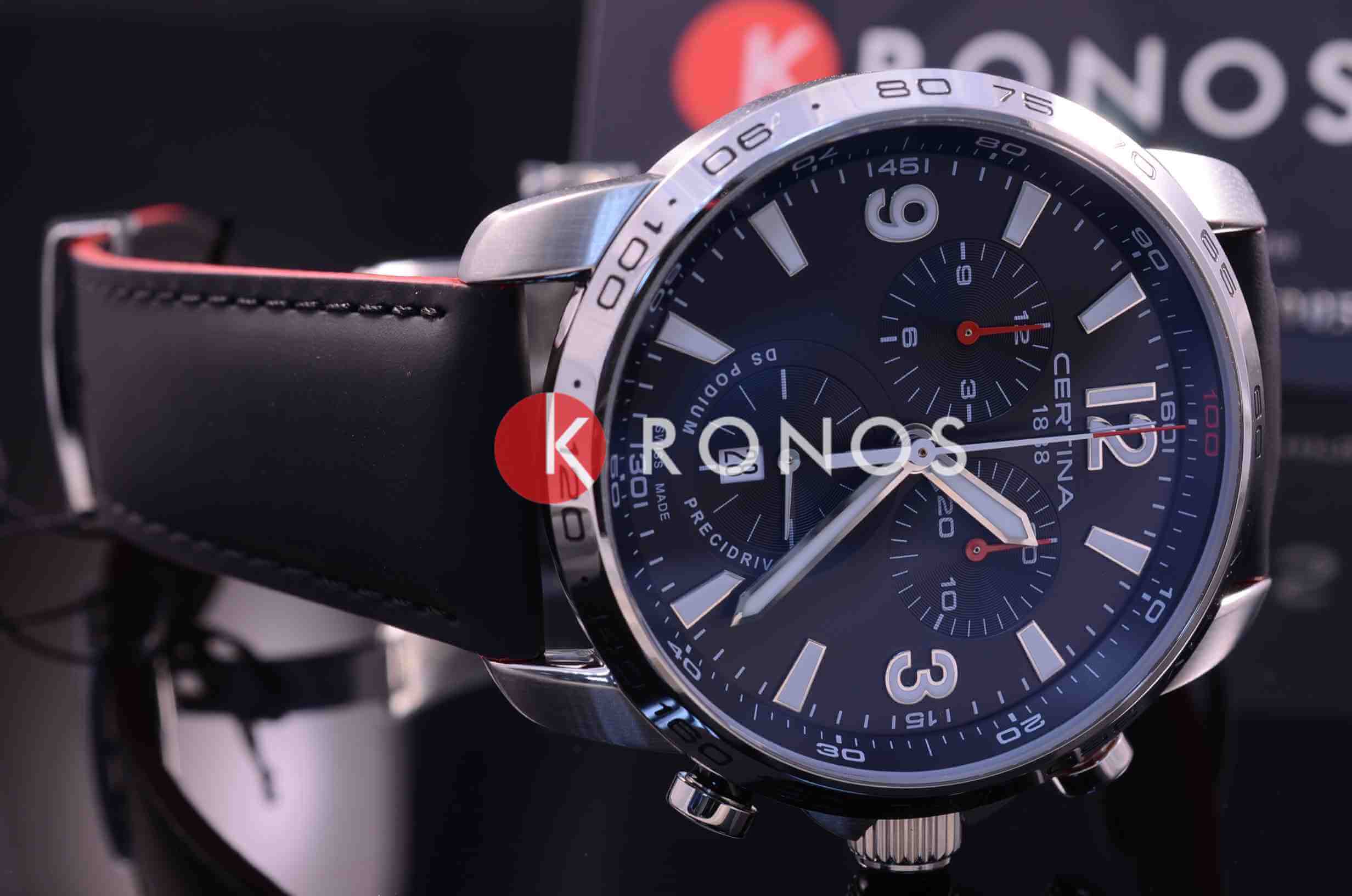 Брендовый хронографХронографФункция позволяет измерять отрезки времени с особой точностью: часы, минуты, секунды. Верным признаком хронографа является наличие на циферблате 3 дополнительных окошек-счётчиков. в чёрно-серебристом исполнении дополнен красными элементами, придающими общему виду динамичность. Наручные часы отличаются повышенной устойчивостью к высоким нагрузкам благодаря реализации фирменной концепции Двойной Надёжности DS ConceptDS ConceptDouble Security Concept, обозначает двойную надёжность и безупречную точность часов Certina. Двойная система защиты подразумевает обеспечение максимальной устойчивости к ударам и высоких показателей водонепроницаемости.. Швейцарский кварцевый механизм с высокой точностью хода ETA 251.264 AA Precidrive™Precidrive™Инновационный кварцевый механизм Certina. Часы, оснащённые этим швейцарским калибром, приравниваются к точности к сертифицированным хронометрам, точность хода составляет +/-10 секунд в год.. Повышенная водонепроницаемость WR 200. Завинчивающаяся заводная головка с защитой, закручивающаяся задняя крышка с гравировкой. Двухстороннее антибликовое покрытие сапфирового стекла. БезельБезельВнешний ободок, закрепляющий стекло. В спортивных часах так называется поворотное кольцо с делениями на циферблате, выполняет роль таймера – замеряет отрезки времени на шкале. Неподвижный безель – элемент декора. Однонаправленно вращающийся безель на дайверских часах позволяет фиксировать моменты погружения и выныривания на поверхность. со шкалой тахиметраТахиметрРазмеченная шкала, располагается на ободке или безеле часов. Тахиметр позволяет рассчитать скорость на определённом участке пути, расстояние измеряется в километрах или милях.. Яркая люминесцентная подсветкаЛюминесцентное покрытиеПозволяет считывать показания времени в темноте. Производители наносят на стрелки, часовые индексы, безель или поверхность циферблата светонакопительный состав, дающий холодное свечение.. Кожаный ремешок из натурального материала. Механизм индикации часовых поясов, отображение даты, измерение времени с точностью до 1/100 секунды. . Диаметр корпуса: 44 мм.