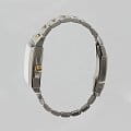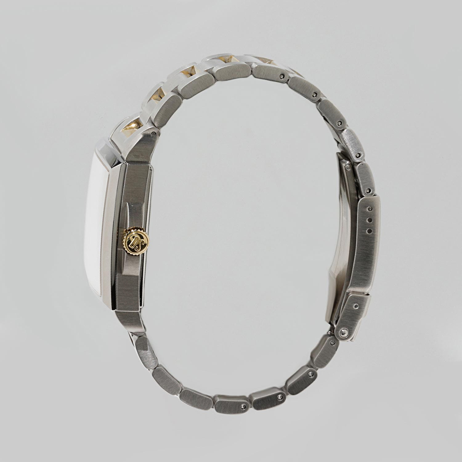 Кварцевый механизм с высокой точностью. Сапфировое стеклоСапфировое стеклоПрочный и надёжный материал из кристалла сапфира синтетического происхождения, характеризующийся особой твёрдостью и устойчивостью к царапинам и повреждениям. устойчивое к появлению царапин, обладающее высокой прозрачностью. Стрелки с люминесцентным покрытиемЛюминесцентное покрытиеПозволяет считывать показания времени в темноте. Производители наносят на стрелки, часовые индексы, безель или поверхность циферблата светонакопительный состав, дающий холодное свечение.. Класс водозащиты: 50 метров, позволит защитить корпус от случайных брызг или капель дождя. Корпус часов изготовлен из нержавеющей стали. Браслет с частичным PVD-покрытиемPVDУльтратонкое покрытие наносится в технике вакуумного напыления, сочетает в себе нитрид титана особой прочности со слоем золота или оксида хрома. Несёт в себе декоративную или защитную функцию. и с застёжкой «бабочка» с кнопкамиЗастёжка "бабочка"Такой вид застёжки дополняется предохранителями, помогающими избежать случайного раскрытия браслета. Обладают изящным исполнением. .