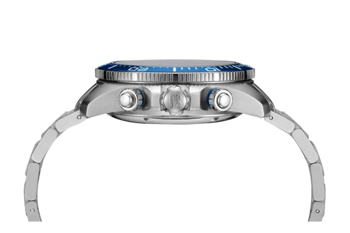 Коллекция DS Action открывает новые «глубины» часового искусства в прямом смысле этого слова: эти «морские» часы в стиле унисекс отличаются точностью, исключительной водостойкостью и динамичным дизайном – идеальный выбор для любой ситуации. Швейцарские мужские механические часы Certina DS Action Diver Chrono C032.827.11.041.00 из коллекции DS Action – безупречно точный и впечатляюще надёжный аксессуар. Габаритный хронографХронографФункция позволяет измерять отрезки времени с особой точностью: часы, минуты, секунды. Верным признаком хронографа является наличие на циферблате 3 дополнительных окошек-счётчиков. с синим циферблатом выгодно подчеркнёт повседневный или деловой образ. Модель соответствует стандарту ISO 6425 для дайверских часов и может похвастаться повышенной водостойкостью до 30 бар. Заводная головка, кнопки и задняя крышка завинчиваются для дополнительной герметичности. Аксессуар позволит вам чувствовать себя на высоте и в воде, и на суше. Сапфировое стеклоСапфировое стеклоПрочный и надёжный материал из кристалла сапфира синтетического происхождения, характеризующийся особой твёрдостью и устойчивостью к царапинам и повреждениям. с двухсторонней антибликовой обработкой. Керамический вращающийся безельБезельВнешний ободок, закрепляющий стекло. В спортивных часах так называется поворотное кольцо с делениями на циферблате, выполняет роль таймера – замеряет отрезки времени на шкале. Неподвижный безель – элемент декора. Однонаправленно вращающийся безель на дайверских часах позволяет фиксировать моменты погружения и выныривания на поверхность.. Корпус из нержавеющей стали 316L. Люминесцентная подсветкаЛюминесцентное покрытиеПозволяет считывать показания времени в темноте. Производители наносят на стрелки, часовые индексы, безель или поверхность циферблата светонакопительный состав, дающий холодное свечение.. Календарь, секундомер. Стальной браслет на раскладной застёжкеРаскладная застёжкаТакой тип застёжки используется только на браслетах из металла. Она никогда не раскрывается полностью, происходит разделение на 2 и более частей. Раскладывающая застёжка снизит вероятность потери часов к минимуму.. Диаметр корпуса: 44,6 мм. Производство и сборка: Швейцария.