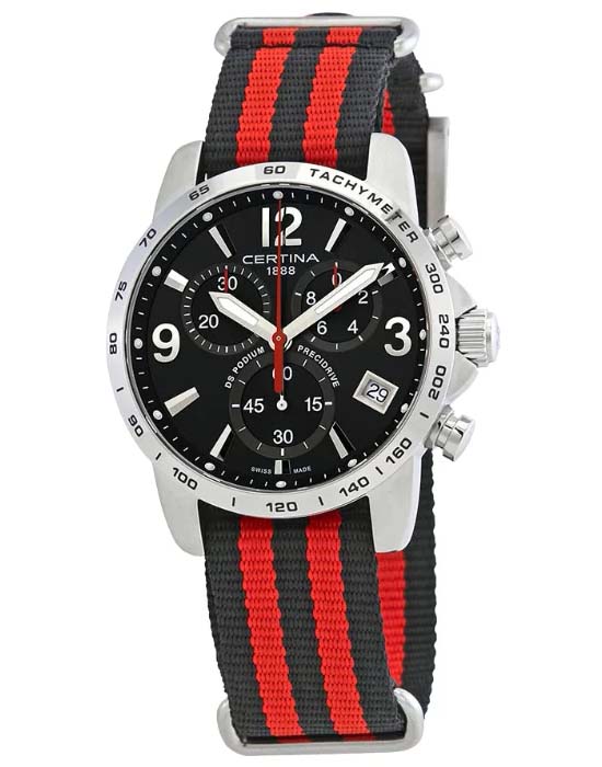 Швейцарские мужские часы Certina C034.417.18.057.00 из линейки DS Podium станут превосходным подарком для тех, кто действительно разбирается в часовом мастерстве и знает толк в качественных вещах. Наручные часы гармонично объединяет лаконичность чёрного циферблата и металлический блеск нержавеющей стали 316L. Спортивный аксессуар будет идеальным компаньоном для повседневного образа. Швейцарский кварцевый калибр ETA G10.212 Precidrive™Precidrive™Инновационный кварцевый механизм Certina. Часы, оснащённые этим швейцарским калибром, приравниваются к точности к сертифицированным хронометрам, точность хода составляет +/-10 секунд в год. отличается отменной точностью хода и никогда не подведёт вас. Водонепроницаемость до 10 бар. Реализация концепции DS ConceptDS ConceptDouble Security Concept, обозначает двойную надёжность и безупречную точность часов Certina. Двойная система защиты подразумевает обеспечение максимальной устойчивости к ударам и высоких показателей водонепроницаемости.. Антибликовая обработка для сапфирового стекла. Люминесцентная подсветкаЛюминесцентное покрытиеПозволяет считывать показания времени в темноте. Производители наносят на стрелки, часовые индексы, безель или поверхность циферблата светонакопительный состав, дающий холодное свечение.. Заводная головка с защитой. Ударопрочный корпусУдаропрочный корпусМеханизм заключён в корпус, выполненный из современных материалов, устойчивых к ударам, механическим повреждениям и падению с высоты: инновационный пластик, карбон, нержавеющая сталь, титан.. Текстильный ремешок. Окошко даты, шкала тахиметраТахиметрРазмеченная шкала, располагается на ободке или безеле часов. Тахиметр позволяет рассчитать скорость на определённом участке пути, расстояние измеряется в километрах или милях., секундомер, хронографХронографФункция позволяет измерять отрезки времени с особой точностью: часы, минуты, секунды. Верным признаком хронографа является наличие на циферблате 3 дополнительных окошек-счётчиков.. Диаметр корпуса: 41 мм. Производство и сборка: Швейцария.