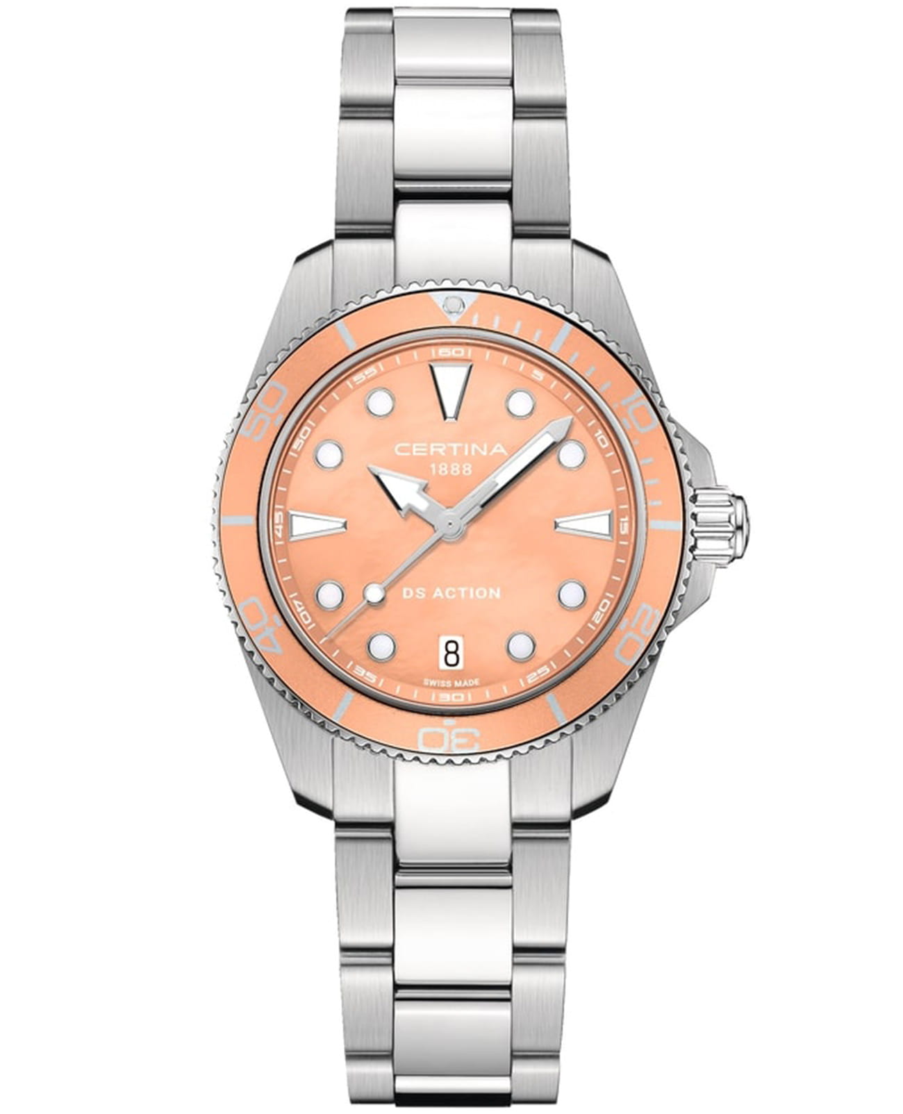 Certina DS Action Lady C048.210.11.381.00 – элегантные женские часы, сочетающие изысканный стиль и высокую функциональность. Корпус диаметром 34,5 мм выполнен из нержавеющей стали 316L, обеспечивающей прочность и долговечность. Серый циферблат украшен метками с люминесцентным покрытиемЛюминесцентное покрытиеПозволяет считывать показания времени в темноте. Производители наносят на стрелки, часовые индексы, безель или поверхность циферблата светонакопительный состав, дающий холодное свечение., обеспечивающим отличную читаемость в любых условиях, и защищён сапфировым стекломСапфировое стеклоПрочный и надёжный материал из кристалла сапфира синтетического происхождения, характеризующийся особой твёрдостью и устойчивостью к царапинам и повреждениям. с антибликовым покрытиемАнтибликовое покрытиеСлой оксида металла в 0,13-0,3 микрон, благодаря которому стекло часов не бликует и не отражает свет. Антибликовое покрытие уменьшает отражение света в 10 раз, обеспечивая отличную читаемость показателей циферблата., устойчивым к царапинам. БезельБезельВнешний ободок, закрепляющий стекло. В спортивных часах так называется поворотное кольцо с делениями на циферблате, выполняет роль таймера – замеряет отрезки времени на шкале. Неподвижный безель – элемент декора. Однонаправленно вращающийся безель на дайверских часах позволяет фиксировать моменты погружения и выныривания на поверхность. с PVD-покрытиемPVDУльтратонкое покрытие наносится в технике вакуумного напыления, сочетает в себе нитрид титана особой прочности со слоем золота или оксида хрома. Несёт в себе декоративную или защитную функцию.. Часы оснащены швейцарским кварцевым механизмом ETA F05.412 с технологией Precidrive™Precidrive™Инновационный кварцевый механизм Certina. Часы, оснащённые этим швейцарским калибром, приравниваются к точности к сертифицированным хронометрам, точность хода составляет +/-10 секунд в год., обеспечивающей высокую точность хода. Функция EOLEOLПредставляет собой систему, уведомляющую владельца часов о необходимости замены элемента питания. За 2 недели до полного разряда батарейки секундная стрелка перестаёт ходить чётко и начинает перепрыгивать на 3-4 деления. (индикатор окончания заряда батареи) своевременно предупреждает о необходимости замены элемента питания. Браслет из нержавеющей стали 316L оснащён системой быстрой замены, позволяющей легко менять ремешки без использования инструментов. Водонепроницаемость 300 метров (30 бар) делает эту модель идеальным выбором для плавания и дайвинга.