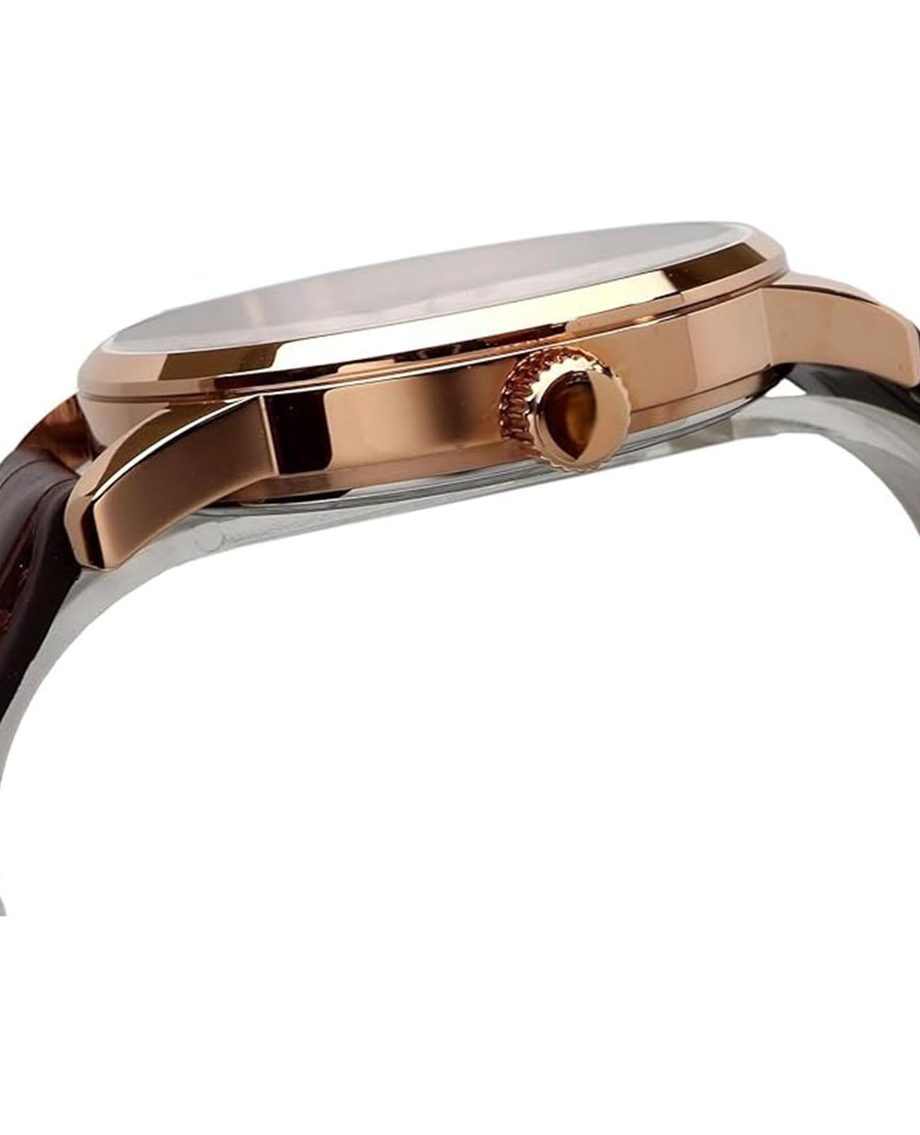 Часы Citizen AK5003-05A произведены в Японии и оснащены надёжным кварцевым механизмом калибра Citizen 6324. Корпус выполнен из нержавеющей стали с элегантным золотистым IP-покрытиемIP-покрытиеМетод ионного напыления. Демонстрирует повышенную устойчивость к истиранию, окислению и химическим веществам. Под воздействием высокого давления и температуры около 1500°C молекулы металла надёжно соединяются с частицами корпуса часов. и имеет классическую круглую форму диаметром 42 мм. Минеральное стеклоМинеральное стеклоМинеральное стекло представляет собой искусственно выращенный минерал кварца. Такое стекло отличается особой устойчивостью к повреждениям и царапинам. Уступает по некоторым качествам сапфировому стеклу. защищает серебристый циферблат, украшенный эффектом солнечных лучей по технологии Sunray. На циферблате расположены клиновидные стрелки в стиле Dauphine, метки в виде штрихов и римская цифра в положении 12 часов, а также индикатор фазы Луны — одно из самых востребованных усложнений в часовой классике. Часы защищены от воды по стандарту 50WR, что позволяет не бояться случайных брызг и дождя. Заводная головка отличается рифлёной поверхностью для удобства использования. Модель комплектуется коричневым кожаным ремешком с тиснением под кожу аллигатора и классической застёжкой. В качестве элемента питания используется батарейка SR621SW, обеспечивающая автономную работу до двух лет.