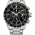 Citizen Chronograph AN3681-57E часы-хронографХронографФункция позволяет измерять отрезки времени с особой точностью: часы, минуты, секунды. Верным признаком хронографа является наличие на циферблате 3 дополнительных окошек-счётчиков. с секундомеромСекундомерСекундоме́р — прибор, способный измерять интервалы времени с точностью до долей секунды. спортивного дизайна с высоким уровнем водозащиты. Корпус из нержавеющей стали диаметром 44 мм идеально сбалансирован. Минеральное стеклоМинеральное стеклоМинеральное стекло представляет собой искусственно выращенный минерал кварца. Такое стекло отличается особой устойчивостью к повреждениям и царапинам. Уступает по некоторым качествам сапфировому стеклу. обеспечивает отличную защиту циферблата от царапин. Часы работают на основе кварцевого механизма. Стальной браслет на раскладной застёжкеРаскладная застёжкаТакой тип застёжки используется только на браслетах из металла. Она никогда не раскрывается полностью, происходит разделение на 2 и более частей. Раскладывающая застёжка снизит вероятность потери часов к минимуму. идеально дополняют дизайн часов, обеспечивая комфортное ношение. Стрелки и метки на циферблате имеют люминесцентное покрытиеЛюминесцентное покрытиеПозволяет считывать показания времени в темноте. Производители наносят на стрелки, часовые индексы, безель или поверхность циферблата светонакопительный состав, дающий холодное свечение. позволяющее легко определять время даже в темноте. БезельБезельВнешний ободок, закрепляющий стекло. В спортивных часах так называется поворотное кольцо с делениями на циферблате, выполняет роль таймера – замеряет отрезки времени на шкале. Неподвижный безель – элемент декора. Однонаправленно вращающийся безель на дайверских часах позволяет фиксировать моменты погружения и выныривания на поверхность. с IP-покрытиемIP-покрытиеМетод ионного напыления. Демонстрирует повышенную устойчивость к истиранию, окислению и химическим веществам. Под воздействием высокого давления и температуры около 1500°C молекулы металла надёжно соединяются с частицами корпуса часов. и шкалой тахиметраТахиметрРазмеченная шкала, располагается на ободке или безеле часов. Тахиметр позволяет рассчитать скорость на определённом участке пути, расстояние измеряется в километрах или милях.. Секундомер с точностью 1с и временем измерения 12ч отображается центральной стрелкой. Циферблат с метками в виде штрихов выполнен по технологии Sunray (солнечные лучи). Окошко даты находится в положении 3 часа. Часы обладают впечатляющей водонепроницаемостью до 100WR, что делает их идеальными для повседневной носки.