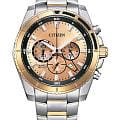 Citizen Chronograph AN8204-59X часы-хронографХронографФункция позволяет измерять отрезки времени с особой точностью: часы, минуты, секунды. Верным признаком хронографа является наличие на циферблате 3 дополнительных окошек-счётчиков. с секундомеромСекундомерСекундоме́р — прибор, способный измерять интервалы времени с точностью до долей секунды.. Корпус из нержавеющей стали диаметром 46,4 мм идеально сбалансирован. Минеральное стеклоМинеральное стеклоМинеральное стекло представляет собой искусственно выращенный минерал кварца. Такое стекло отличается особой устойчивостью к повреждениям и царапинам. Уступает по некоторым качествам сапфировому стеклу. обеспечивает отличную защиту циферблата от царапин. Часы работают на основе кварцевого механизма. Стальной браслет на раскладной застёжкеРаскладная застёжкаТакой тип застёжки используется только на браслетах из металла. Она никогда не раскрывается полностью, происходит разделение на 2 и более частей. Раскладывающая застёжка снизит вероятность потери часов к минимуму. идеально дополняют дизайн часов, обеспечивая комфортное ношение. БезельБезельВнешний ободок, закрепляющий стекло. В спортивных часах так называется поворотное кольцо с делениями на циферблате, выполняет роль таймера – замеряет отрезки времени на шкале. Неподвижный безель – элемент декора. Однонаправленно вращающийся безель на дайверских часах позволяет фиксировать моменты погружения и выныривания на поверхность. с IP-покрытиемIP-покрытиеМетод ионного напыления. Демонстрирует повышенную устойчивость к истиранию, окислению и химическим веществам. Под воздействием высокого давления и температуры около 1500°C молекулы металла надёжно соединяются с частицами корпуса часов.. Секундомер с точностью показаний 1c и временем измерения 60мин. Окошко даты находится между часовыми отметками 4 и 5. 12-ти и 24-х часовой формат времени отображается на отдельном циферблате. Заводная головка с защитой. Часы обладают впечатляющей водонепроницаемостью до 100WR, что делает их идеальными для повседневной носки.