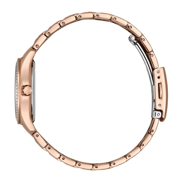Изящные женские часы Citizen FE1252-82X сочетают в себе современную японскую точность и утончённый стиль. Кварцевый механизм обеспечивает надёжную работу и минимальное отклонение времени. Корпус диаметром 29,5 мм и толщиной 8,5 мм выполнен из нержавеющей стали с изысканным  IP-покрытиемIP-покрытиеМетод ионного напыления. Демонстрирует повышенную устойчивость к истиранию, окислению и химическим веществам. Под воздействием высокого давления и температуры около 1500°C молекулы металла надёжно соединяются с частицами корпуса часов. розового золота, что придаёт изделию особый шарм. А безельБезельВнешний ободок, закрепляющий стекло. В спортивных часах так называется поворотное кольцо с делениями на циферблате, выполняет роль таймера – замеряет отрезки времени на шкале. Неподвижный безель – элемент декора. Однонаправленно вращающийся безель на дайверских часах позволяет фиксировать моменты погружения и выныривания на поверхность. часов покрыт кристаллами, что придаёт аксессуару изящный и утончённый вид. Розовый циферблат украшен 60 сверкающими кристаллами, создавая эффектное мерцание при каждом движении. Центральные стрелки отображают часы, минуты и секунды, а окошко даты расположено на отметке «3 часа» для удобства отслеживания текущей даты. Стрелки с люминесцентным покрытиемЛюминесцентное покрытиеПозволяет считывать показания времени в темноте. Производители наносят на стрелки, часовые индексы, безель или поверхность циферблата светонакопительный состав, дающий холодное свечение. обеспечивают отличную читаемость времени даже в темное время суток. Часы оснащены прочным минеральным стекломМинеральное стеклоМинеральное стекло представляет собой искусственно выращенный минерал кварца. Такое стекло отличается особой устойчивостью к повреждениям и царапинам. Уступает по некоторым качествам сапфировому стеклу., защищающим от случайных царапин, и водозащитой уровня WR50, что позволяет не беспокоиться о брызгах и дожде. Стальной браслет с раскладной застёжкойРаскладная застёжкаТакой тип застёжки используется только на браслетах из металла. Она никогда не раскрывается полностью, происходит разделение на 2 и более частей. Раскладывающая застёжка снизит вероятность потери часов к минимуму. на кнопке обеспечивает надёжную фиксацию и комфортную посадку на запястье.