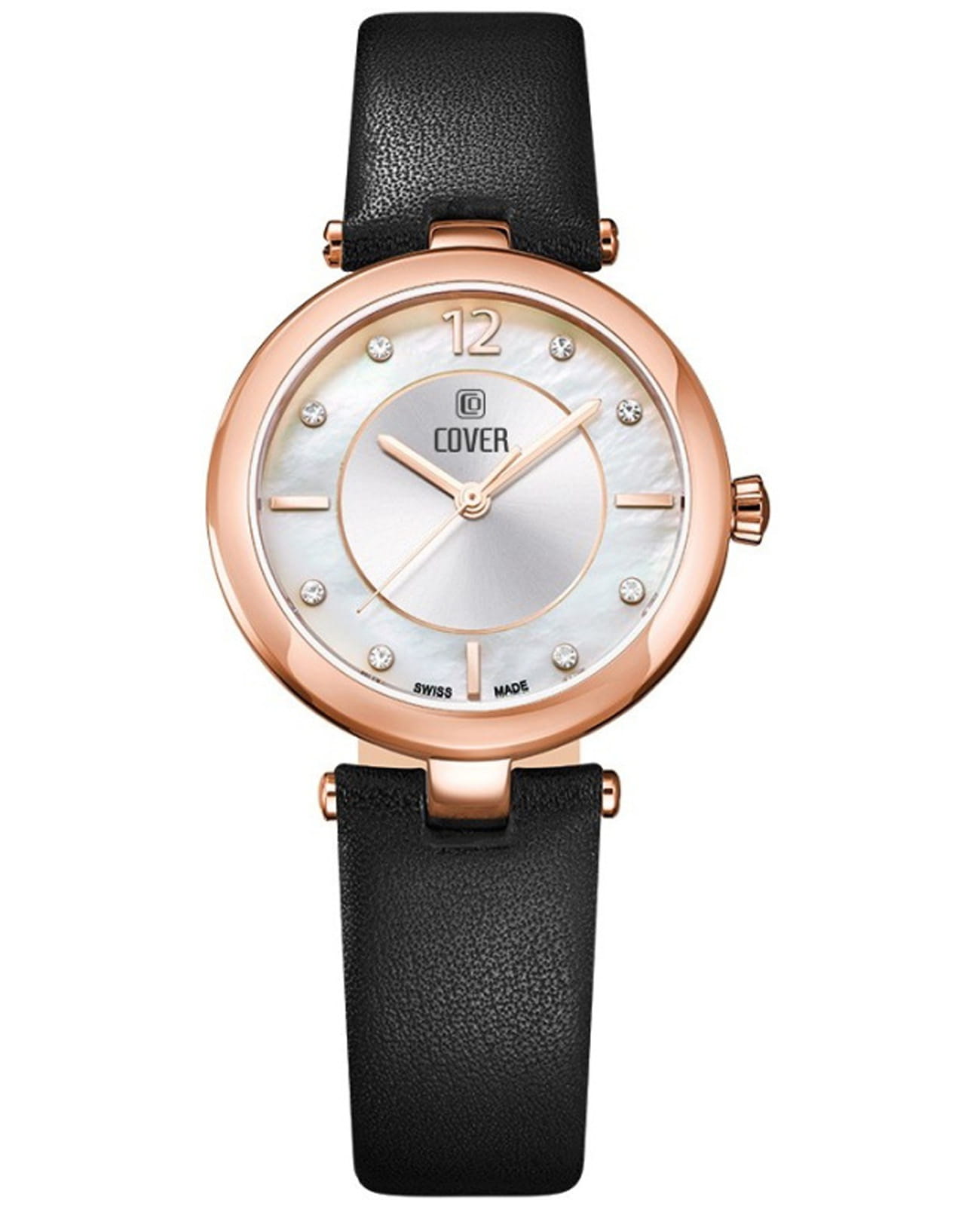 Женственные коктейльные часы COVER CO193.09 из коллекции Amelia работают на кварцевом калибре ETA. Циферблат имеет центральную область серебристого цвета с узором Sunray и белую перламутровую периферийную часть, которые защищены минеральным стекломМинеральное стеклоМинеральное стекло представляет собой искусственно выращенный минерал кварца. Такое стекло отличается особой устойчивостью к повреждениям и царапинам. Уступает по некоторым качествам сапфировому стеклу. с сапфировым напылением. В качестве часовых меток используются 8 кристаллов Swarovski, а также 3 накладных индекса и арабская цифра «12». Корпус 32 мм диаметром выполнен из нержавеющей стали с PVD-покрытиемPVDУльтратонкое покрытие наносится в технике вакуумного напыления, сочетает в себе нитрид титана особой прочности со слоем золота или оксида хрома. Несёт в себе декоративную или защитную функцию. цвета розового золота, с широким полированным безелемБезельВнешний ободок, закрепляющий стекло. В спортивных часах так называется поворотное кольцо с делениями на циферблате, выполняет роль таймера – замеряет отрезки времени на шкале. Неподвижный безель – элемент декора. Однонаправленно вращающийся безель на дайверских часах позволяет фиксировать моменты погружения и выныривания на поверхность.. Часы комплектуются черным кожаным ремешком на стандартной застёжке и имеют маркировку «Swiss Made».