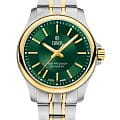 Женские наручные часы Cover CO201.32 из коллекции Marville сочетают в себе классический дизайн и высокую точность швейцарского производства. Модель обладает круглым корпусом диаметром 28 мм, изготовленным из нержавеющей стали, что придает изделию благородный внешний вид. Зеленый циферблат оснащен стрелками с люминесцентным покрытиемЛюминесцентное покрытиеПозволяет считывать показания времени в темноте. Производители наносят на стрелки, часовые индексы, безель или поверхность циферблата светонакопительный состав, дающий холодное свечение..  Для защиты используется сапфировое стеклоСапфировое стеклоПрочный и надёжный материал из кристалла сапфира синтетического происхождения, характеризующийся особой твёрдостью и устойчивостью к царапинам и повреждениям. с антибликовым покрытиемАнтибликовое покрытиеСлой оксида металла в 0,13-0,3 микрон, благодаря которому стекло часов не бликует и не отражает свет. Антибликовое покрытие уменьшает отражение света в 10 раз, обеспечивая отличную читаемость показателей циферблата., обеспечивающее прочную защиту от царапин и превосходную читаемость времени даже при ярком свете. БезельБезельВнешний ободок, закрепляющий стекло. В спортивных часах так называется поворотное кольцо с делениями на циферблате, выполняет роль таймера – замеряет отрезки времени на шкале. Неподвижный безель – элемент декора. Однонаправленно вращающийся безель на дайверских часах позволяет фиксировать моменты погружения и выныривания на поверхность. с золотистым PVD-покрытиемPVDУльтратонкое покрытие наносится в технике вакуумного напыления, сочетает в себе нитрид титана особой прочности со слоем золота или оксида хрома. Несёт в себе декоративную или защитную функцию.. Часы работают на высокоточном кварцевом механизме ETA, гарантирующем исключительную точность хода с погрешностью около 20 секунд в месяц. Браслет выполнен из нержавеющей стали с частичным PVD-покрытиемPVDУльтратонкое покрытие наносится в технике вакуумного напыления, сочетает в себе нитрид титана особой прочности со слоем золота или оксида хрома. Несёт в себе декоративную или защитную функцию. и оснащен раскладной застежкойРаскладная застёжкаТакой тип застёжки используется только на браслетах из металла. Она никогда не раскрывается полностью, происходит разделение на 2 и более частей. Раскладывающая застёжка снизит вероятность потери часов к минимуму., обеспечивающей комфортное ношение и безопасность. Водонепроницаемость достигает 10 атмосфер (100 метров), что позволяет использовать их во время плавания и других водных видов спорта, однако не рекомендуется для глубоководного дайвинга. Эти швейцарские часы станут идеальным дополнением как классического, так и современного образа.