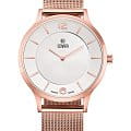 Женские наручные часы Cover CO2037.09 из коллекции Essential сочетают в себе классический дизайн и высокую точность швейцарского производства. Модель обладает круглым корпусом диаметром 38 мм, изготовленным из нержавеющей стали с PVD-покрытиемPVDУльтратонкое покрытие наносится в технике вакуумного напыления, сочетает в себе нитрид титана особой прочности со слоем золота или оксида хрома. Несёт в себе декоративную или защитную функцию. цвета розового золота, что придает изделию благородный внешний вид. Для защиты используется сапфировое стеклоСапфировое стеклоПрочный и надёжный материал из кристалла сапфира синтетического происхождения, характеризующийся особой твёрдостью и устойчивостью к царапинам и повреждениям. с антибликовым покрытиемАнтибликовое покрытиеСлой оксида металла в 0,13-0,3 микрон, благодаря которому стекло часов не бликует и не отражает свет. Антибликовое покрытие уменьшает отражение света в 10 раз, обеспечивая отличную читаемость показателей циферблата., обеспечивающее прочную защиту от царапин и превосходную читаемость времени даже при ярком свете. Часы работают на высокоточном кварцевом механизме, гарантирующем исключительную точность хода с погрешностью около 20 секунд в месяц. Браслет "миланского плетения" выполнен из нержавеющей стали с PVD-покрытиемPVDУльтратонкое покрытие наносится в технике вакуумного напыления, сочетает в себе нитрид титана особой прочности со слоем золота или оксида хрома. Несёт в себе декоративную или защитную функцию. цвета розового золота и оснащен раскладным замком, который легко можно подогнать по руке. Водонепроницаемость достигает 5 атмосфер (50 метров), что позволяет использовать их во время дождя и мытья рук, но не рекомендуется для плавания. Эти швейцарские часы станут идеальным дополнением как классического, так и современного образа.