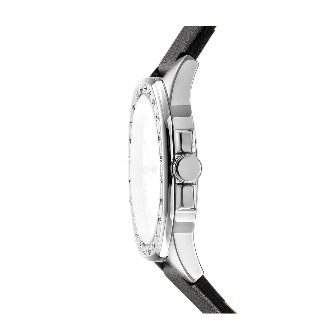 DKNY Brooklyn Maxi DK1L011L0015 — женские кварцевые часы в духе нью-йоркского урбанизма, сочетающие смелый дизайн и функциональность. Корпус из нержавеющей стали диаметром 36 мм и минеральное стеклоМинеральное стеклоМинеральное стекло представляет собой искусственно выращенный минерал кварца. Такое стекло отличается особой устойчивостью к повреждениям и царапинам. Уступает по некоторым качествам сапфировому стеклу. обеспечивает защиту от царапин, а водонепроницаемость до 50 метров делает модель практичной для активного отдыха или повседневной носки. БезельБезельВнешний ободок, закрепляющий стекло. В спортивных часах так называется поворотное кольцо с делениями на циферблате, выполняет роль таймера – замеряет отрезки времени на шкале. Неподвижный безель – элемент декора. Однонаправленно вращающийся безель на дайверских часах позволяет фиксировать моменты погружения и выныривания на поверхность. инкрустирован кристаллами. Кожаный ремешок из кожи с застежкой-пряжкой подчеркивает универсальность, сочетаясь с деловыми и повседневными образами. Лаконичные линии, акцент на крупном формате и практичность делают модель идеальным выбором для женщин, ценящих дерзкий городской образ, сочетающий энергию мегаполиса с универсальной элегантностью.