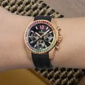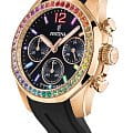 Яркий стиль и функциональность этих часов придутся по душе активной девушке. Часы-хронографХронографФункция позволяет измерять отрезки времени с особой точностью: часы, минуты, секунды. Верным признаком хронографа является наличие на циферблате 3 дополнительных окошек-счётчиков.. Кварцевый механизм с высокой точностью. Минеральное стеклоМинеральное стеклоМинеральное стекло представляет собой искусственно выращенный минерал кварца. Такое стекло отличается особой устойчивостью к повреждениям и царапинам. Уступает по некоторым качествам сапфировому стеклу. устойчивое к появлению царапин, обладающее высокой прозрачностью. Черный циферблат. Стрелки и метки с люминесцентным покрытиемЛюминесцентное покрытиеПозволяет считывать показания времени в темноте. Производители наносят на стрелки, часовые индексы, безель или поверхность циферблата светонакопительный состав, дающий холодное свечение.. БезельБезельВнешний ободок, закрепляющий стекло. В спортивных часах так называется поворотное кольцо с делениями на циферблате, выполняет роль таймера – замеряет отрезки времени на шкале. Неподвижный безель – элемент декора. Однонаправленно вращающийся безель на дайверских часах позволяет фиксировать моменты погружения и выныривания на поверхность. украшен цветными цирконами. Класс водозащиты: 100 метров, позволит плавать, нырять и заниматься другими водными видами спорта. Корпус часов изготовлен из нержавеющей стали с PVD-покрытиемPVDУльтратонкое покрытие наносится в технике вакуумного напыления, сочетает в себе нитрид титана особой прочности со слоем золота или оксида хрома. Несёт в себе декоративную или защитную функцию.. Каучуковый ремешок с классической застежкой.