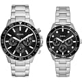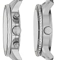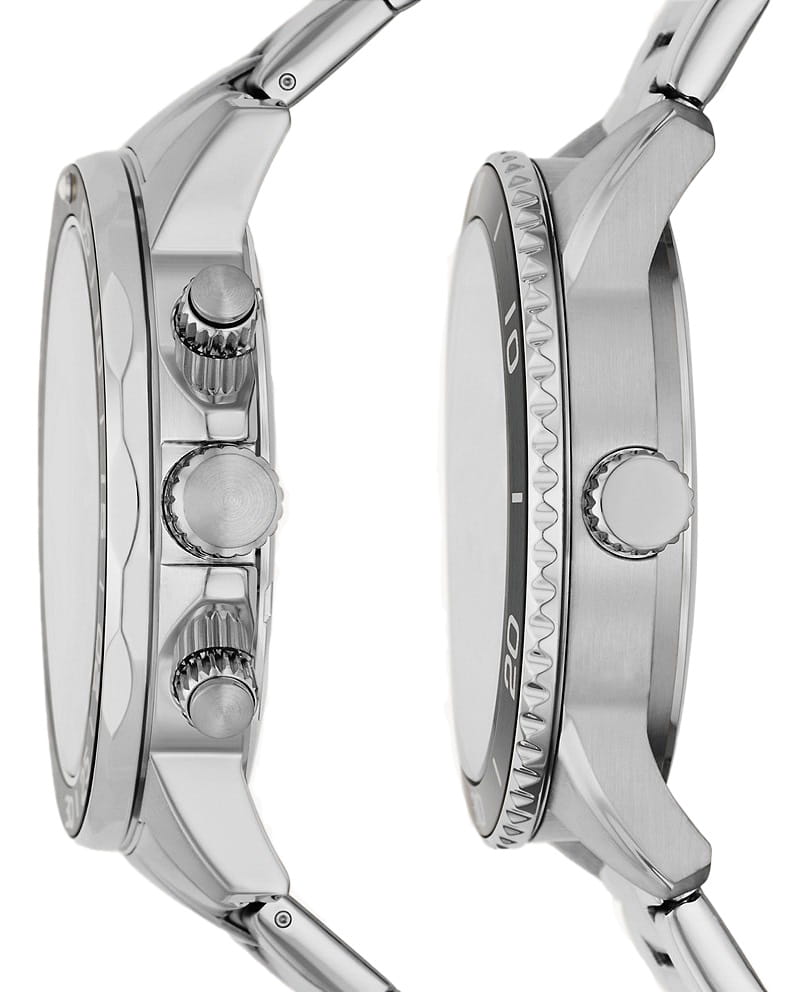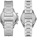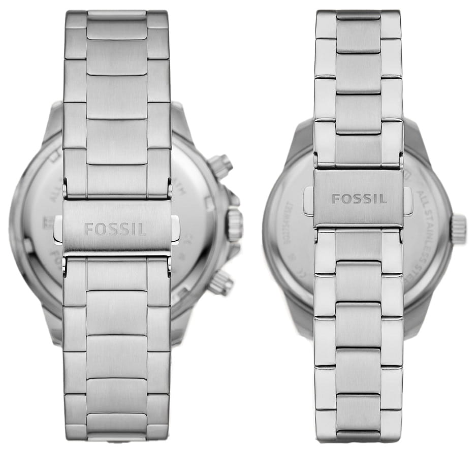 Парный комплект часов Fossil Bannon BQ2753SET, кварцевый механизм с высокой точностью. Минеральное стеклоМинеральное стеклоМинеральное стекло представляет собой искусственно выращенный минерал кварца. Такое стекло отличается особой устойчивостью к повреждениям и царапинам. Уступает по некоторым качествам сапфировому стеклу. устойчивое к мелким механическим повреждениям. Класс водозащиты: 50 метров, позволит защитить корпус от случайных брызг или капель дождя. Корпус часов изготовлен из стали. Стрелки и метки с люминесцентным покрытиемЛюминесцентное покрытиеПозволяет считывать показания времени в темноте. Производители наносят на стрелки, часовые индексы, безель или поверхность циферблата светонакопительный состав, дающий холодное свечение.. Функции даты, дня недели и 24 часового формата времени вынесены на отдельные циферблаты. Ширина корпуса для мужских часов: 45мм, для женских часов: 34мм. Рифленая заводная головка с защитой. Стальной браслет на раскладной застёжкеРаскладная застёжкаТакой тип застёжки используется только на браслетах из металла. Она никогда не раскрывается полностью, происходит разделение на 2 и более частей. Раскладывающая застёжка снизит вероятность потери часов к минимуму. с PVD-покрытиемPVDУльтратонкое покрытие наносится в технике вакуумного напыления, сочетает в себе нитрид титана особой прочности со слоем золота или оксида хрома. Несёт в себе декоративную или защитную функцию.. Ширина браслета для мужских часов: 22мм, для женских часов: 18мм.