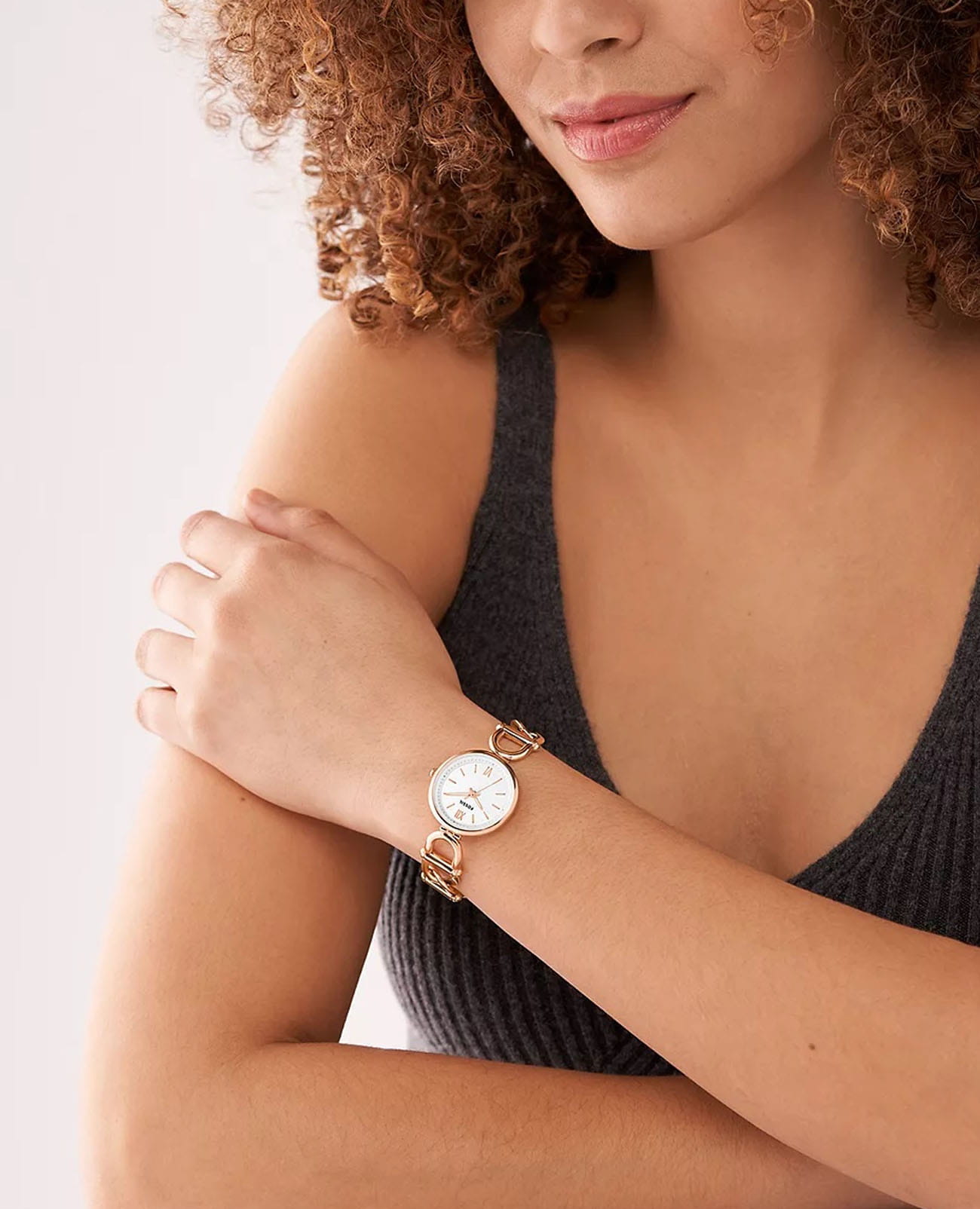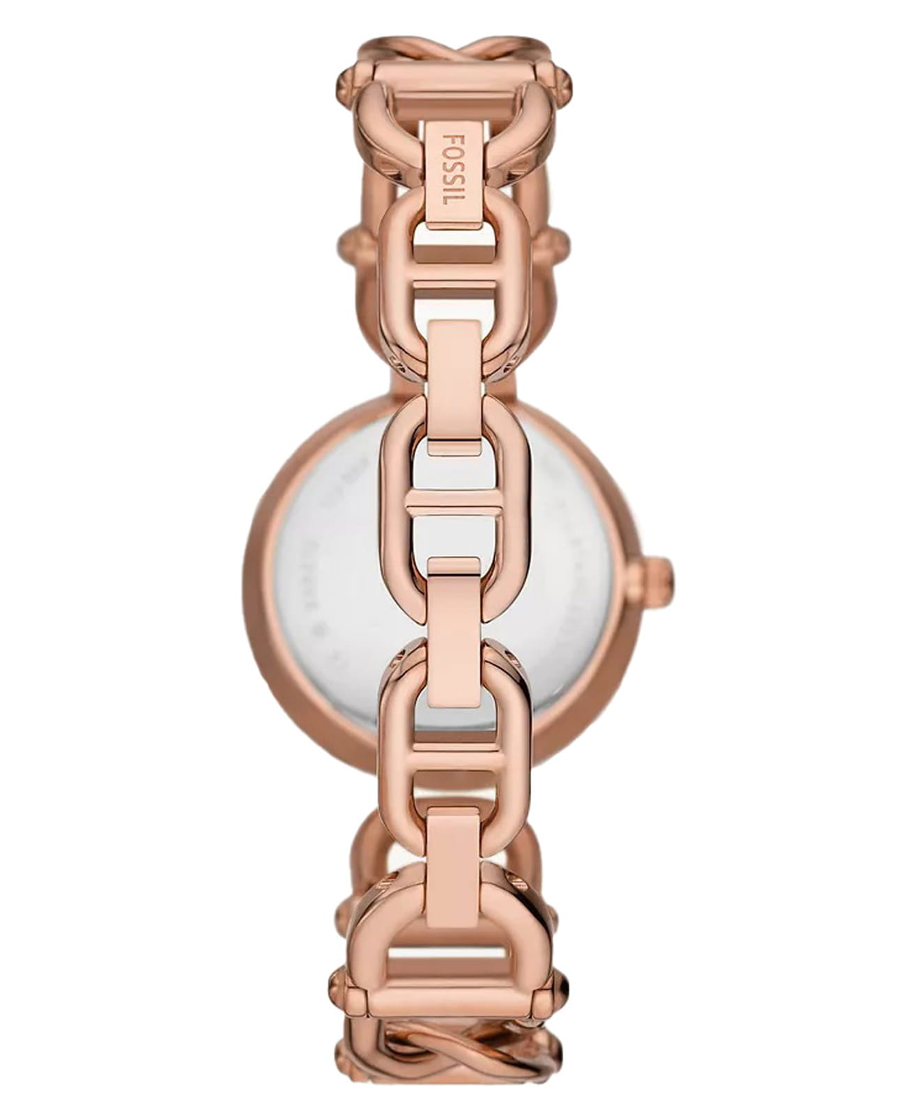 Женские американские часы  с минеральным стекломМинеральное стеклоМинеральное стекло представляет собой искусственно выращенный минерал кварца. Такое стекло отличается особой устойчивостью к повреждениям и царапинам. Уступает по некоторым качествам сапфировому стеклу. Fossil Carlie ES5273, кварцевый механизм с высокой точностью. Корпус и браслет часов изготовлены из нержавеющей стали  с IP-покрытиемIP-покрытиеМетод ионного напыления. Демонстрирует повышенную устойчивость к истиранию, окислению и химическим веществам. Под воздействием высокого давления и температуры около 1500°C молекулы металла надёжно соединяются с частицами корпуса часов.. Стрелки с люминесцентным покрытиемЛюминесцентное покрытиеПозволяет считывать показания времени в темноте. Производители наносят на стрелки, часовые индексы, безель или поверхность циферблата светонакопительный состав, дающий холодное свечение.. Рифленая заводная головка с защитой. Класс водозащиты: 50 метров, позволит защитить корпус от случайных брызг или капель дождя. Стальной браслет в виде звеньев на ювелирной застежке.