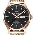 Мужские часы Greenwich Good Luck GW 054.49.31, механический механизм (автоматический калибр) с высокой точностью. Классический круглый стальной корпус с PVD-покрытиемPVDУльтратонкое покрытие наносится в технике вакуумного напыления, сочетает в себе нитрид титана особой прочности со слоем золота или оксида хрома. Несёт в себе декоративную или защитную функцию., защищенный минеральным стекломМинеральное стеклоМинеральное стекло представляет собой искусственно выращенный минерал кварца. Такое стекло отличается особой устойчивостью к повреждениям и царапинам. Уступает по некоторым качествам сапфировому стеклу.. Стрелки и метки с люминесцентным покрытиемЛюминесцентное покрытиеПозволяет считывать показания времени в темноте. Производители наносят на стрелки, часовые индексы, безель или поверхность циферблата светонакопительный состав, дающий холодное свечение.. Стальной браслет с PVD-покрытиемPVDУльтратонкое покрытие наносится в технике вакуумного напыления, сочетает в себе нитрид титана особой прочности со слоем золота или оксида хрома. Несёт в себе декоративную или защитную функцию. миланского плетения на раскладной застёжкеРаскладная застёжкаТакой тип застёжки используется только на браслетах из металла. Она никогда не раскрывается полностью, происходит разделение на 2 и более частей. Раскладывающая застёжка снизит вероятность потери часов к минимуму.. Класс водозащиты: 100 метров, позволит плавать, нырять и заниматься другими водными видами спорта. Окошко даты и дня недели находится в положении 3 часа.