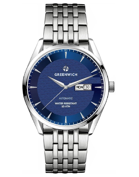 Мужские часы с минеральным стекломМинеральное стеклоМинеральное стекло представляет собой искусственно выращенный минерал кварца. Такое стекло отличается особой устойчивостью к повреждениям и царапинам. Уступает по некоторым качествам сапфировому стеклу. Greenwich Good Luck Classic GW 074.10.36, представляют собой классический вариант для повседневной носки. В центральной части циферблата — отличительная черта моделей этой серии: гильоше, объемные линии которого напоминают волны. Обратите внимание на форму пластины, где крепятся накладные риски: она сделана в форме латинской буквы G, первой буквы в названии бренда. Часы характеризуются традиционными формами, лаконичным исполнением, что делает модель элегантным дополнением к деловому костюму. Сквозь прозрачную заднюю крышку вы увидите детали механизма TMI с декорированным ротором: на нем выгравировано изображение символа английских моряков — парусника. Браслет и застежка-клипса выполнены из гипоаллергенной нержавеющей стали. Дизайн, актуальный для любого современного образа, и надежность используемых материалов делают автоматические часы Greenwich удобным и стильным аксессуаром на каждый день.