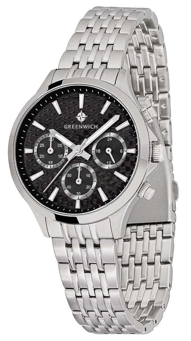 Женские кварцевые часы Greenwich — это сочетание элегантности и функциональности. Корпус диаметром 35 мм выполнен из нержавеющей стали. Циферблат чёрного цвета оформлен с эффектом гильоше в виде волнообразных линий, придающим ему объём и глубину. На циферблате расположены субциферблаты хронографа (секундомер на 60 секунд и 30 минут) и индикатор 24-часового формата. Окошко даты находится в положении 3 часов. Все индикаторы выделены рамками с зеркальной полировкой. Стрелки и метки с люминесцентным покрытиемЛюминесцентное покрытиеПозволяет считывать показания времени в темноте. Производители наносят на стрелки, часовые индексы, безель или поверхность циферблата светонакопительный состав, дающий холодное свечение., обеспечивающим хорошую читаемость в темноте. Циферблат защищён минеральным стекломМинеральное стеклоМинеральное стекло представляет собой искусственно выращенный минерал кварца. Такое стекло отличается особой устойчивостью к повреждениям и царапинам. Уступает по некоторым качествам сапфировому стеклу.. Механизм — кварцевый калибр Miyota с функцией хронографа. Часы оснащены стальным браслетом с комбинированной полировкой (матовые и зеркальные звенья) и удобной раскладной застёжкойРаскладная застёжкаТакой тип застёжки используется только на браслетах из металла. Она никогда не раскрывается полностью, происходит разделение на 2 и более частей. Раскладывающая застёжка снизит вероятность потери часов к минимуму.. Водонепроницаемость 100 м позволяет использовать часы для плавания и повседневного ношения. Гарантия — 24 месяца. Идеальный выбор для тех, кто ценит стиль, точность и надёжность.