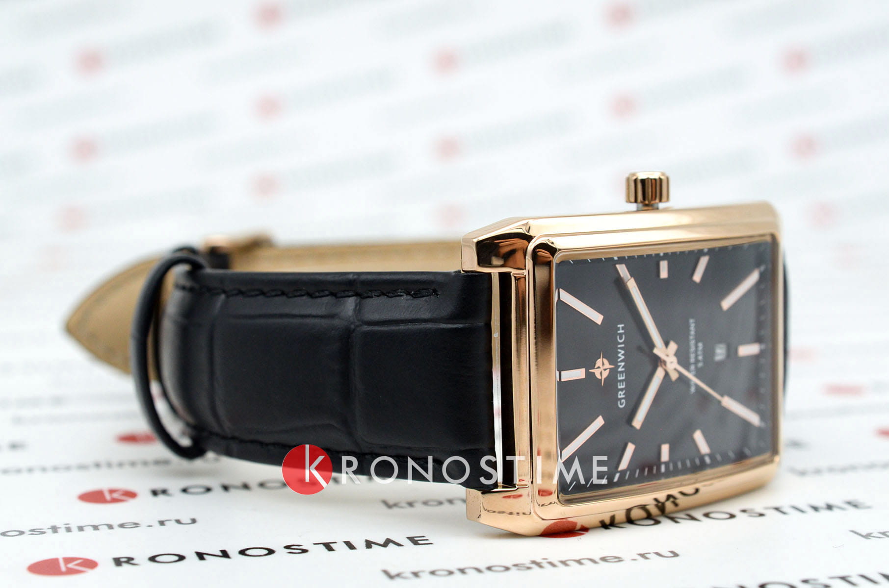 Часы Greenwich GW 571.41.11 из коллекции Galeon — элегантная мужская модель, сочетающая классический дизайн и современные технологии. Корпус размером 33 x 40 мм выполнен из гипоаллергенной нержавеющей стали с PVD-покрытиемPVDУльтратонкое покрытие наносится в технике вакуумного напыления, сочетает в себе нитрид титана особой прочности со слоем золота или оксида хрома. Несёт в себе декоративную или защитную функцию. из розового золота. Чёрный циферблат с крупными стрелками, покрытыми люминесцентным составом, защищён минеральным стекломМинеральное стеклоМинеральное стекло представляет собой искусственно выращенный минерал кварца. Такое стекло отличается особой устойчивостью к повреждениям и царапинам. Уступает по некоторым качествам сапфировому стеклу.. Окошко даты расположено в позиции «6 часов».