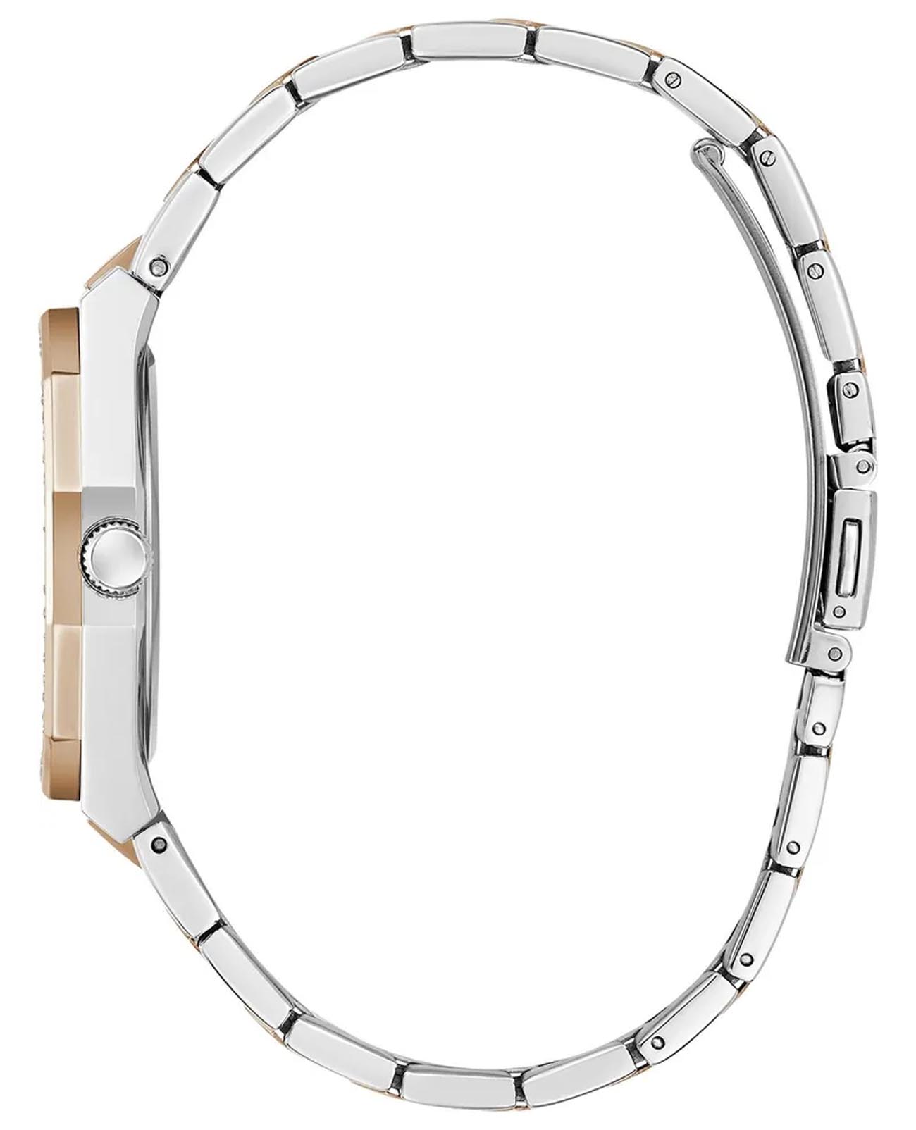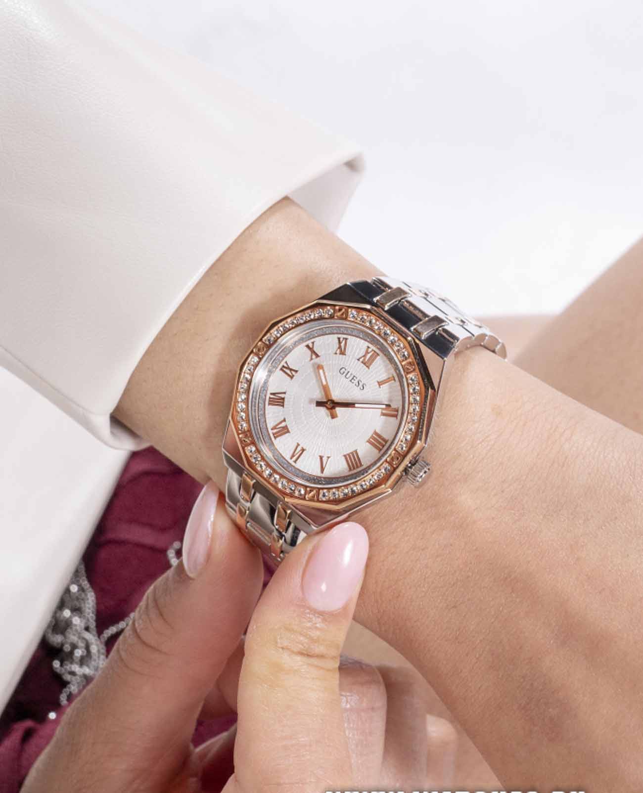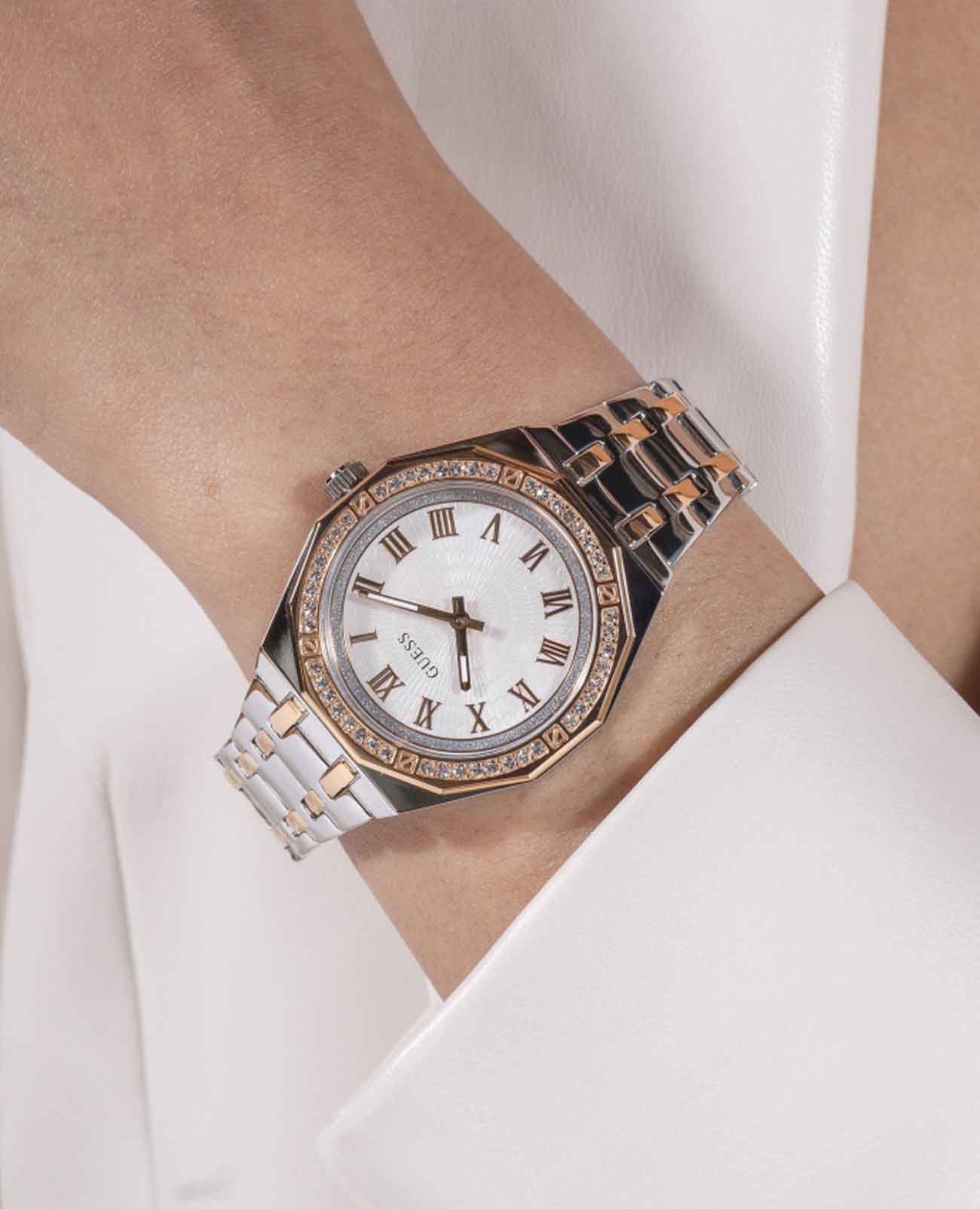 Женские наручные часы Guess Dress GW0770L5 с минеральным стекломМинеральное стеклоМинеральное стекло представляет собой искусственно выращенный минерал кварца. Такое стекло отличается особой устойчивостью к повреждениям и царапинам. Уступает по некоторым качествам сапфировому стеклу., кварцевый механизм с высокой точностью. Корпус часов изготовлен из стали. БезельБезельВнешний ободок, закрепляющий стекло. В спортивных часах так называется поворотное кольцо с делениями на циферблате, выполняет роль таймера – замеряет отрезки времени на шкале. Неподвижный безель – элемент декора. Однонаправленно вращающийся безель на дайверских часах позволяет фиксировать моменты погружения и выныривания на поверхность. с IP-покрытиемIP-покрытиеМетод ионного напыления. Демонстрирует повышенную устойчивость к истиранию, окислению и химическим веществам. Под воздействием высокого давления и температуры около 1500°C молекулы металла надёжно соединяются с частицами корпуса часов. украшен кристаллами. Стрелки с люминесцентным покрытиемЛюминесцентное покрытиеПозволяет считывать показания времени в темноте. Производители наносят на стрелки, часовые индексы, безель или поверхность циферблата светонакопительный состав, дающий холодное свечение.. Класс водозащиты: 50 метров, позволит защитить корпус от случайных брызг или капель дождя. Стальной браслет с частичным IP-покрытиемIP-покрытиеМетод ионного напыления. Демонстрирует повышенную устойчивость к истиранию, окислению и химическим веществам. Под воздействием высокого давления и температуры около 1500°C молекулы металла надёжно соединяются с частицами корпуса часов. на раскладной застёжкеРаскладная застёжкаТакой тип застёжки используется только на браслетах из металла. Она никогда не раскрывается полностью, происходит разделение на 2 и более частей. Раскладывающая застёжка снизит вероятность потери часов к минимуму..