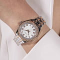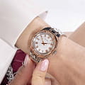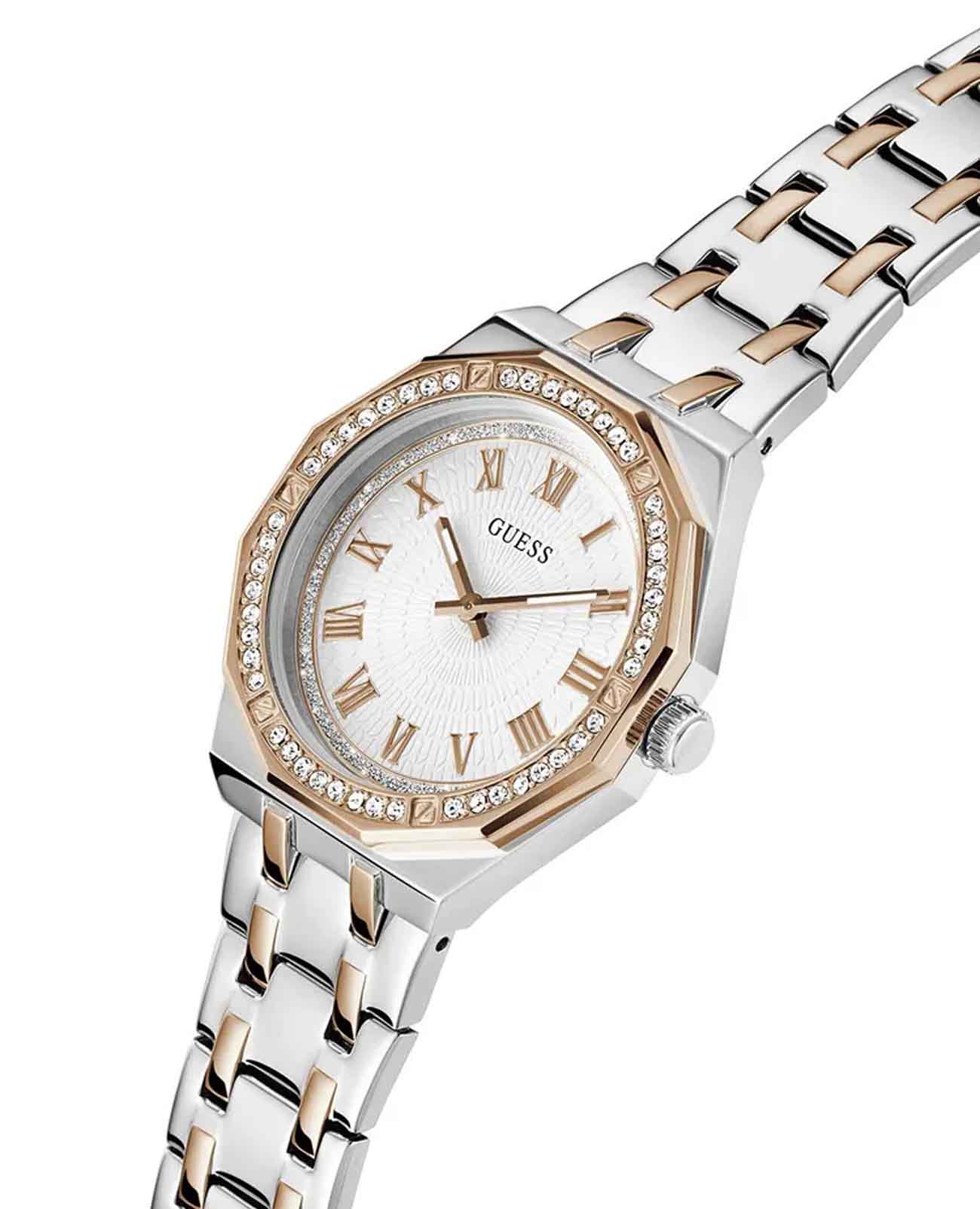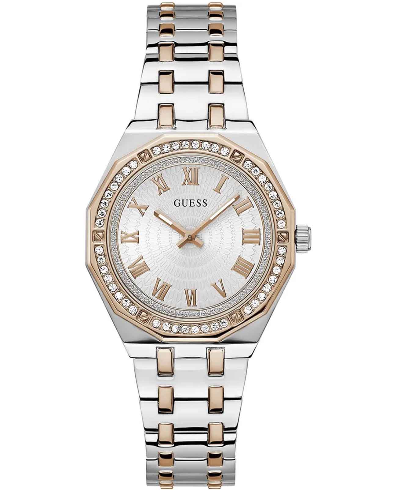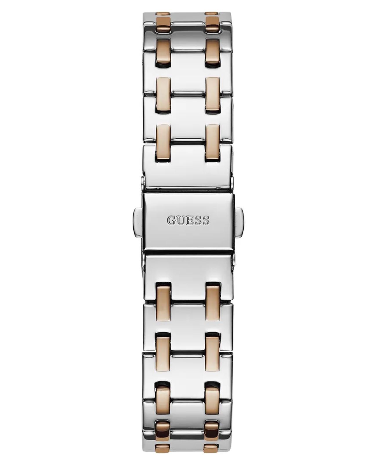 Женские наручные часы Guess Dress GW0770L5 с минеральным стекломМинеральное стеклоМинеральное стекло представляет собой искусственно выращенный минерал кварца. Такое стекло отличается особой устойчивостью к повреждениям и царапинам. Уступает по некоторым качествам сапфировому стеклу., кварцевый механизм с высокой точностью. Корпус часов изготовлен из стали. БезельБезельВнешний ободок, закрепляющий стекло. В спортивных часах так называется поворотное кольцо с делениями на циферблате, выполняет роль таймера – замеряет отрезки времени на шкале. Неподвижный безель – элемент декора. Однонаправленно вращающийся безель на дайверских часах позволяет фиксировать моменты погружения и выныривания на поверхность. с IP-покрытиемIP-покрытиеМетод ионного напыления. Демонстрирует повышенную устойчивость к истиранию, окислению и химическим веществам. Под воздействием высокого давления и температуры около 1500°C молекулы металла надёжно соединяются с частицами корпуса часов. украшен кристаллами. Стрелки с люминесцентным покрытиемЛюминесцентное покрытиеПозволяет считывать показания времени в темноте. Производители наносят на стрелки, часовые индексы, безель или поверхность циферблата светонакопительный состав, дающий холодное свечение.. Класс водозащиты: 50 метров, позволит защитить корпус от случайных брызг или капель дождя. Стальной браслет с частичным IP-покрытиемIP-покрытиеМетод ионного напыления. Демонстрирует повышенную устойчивость к истиранию, окислению и химическим веществам. Под воздействием высокого давления и температуры около 1500°C молекулы металла надёжно соединяются с частицами корпуса часов. на раскладной застёжкеРаскладная застёжкаТакой тип застёжки используется только на браслетах из металла. Она никогда не раскрывается полностью, происходит разделение на 2 и более частей. Раскладывающая застёжка снизит вероятность потери часов к минимуму..