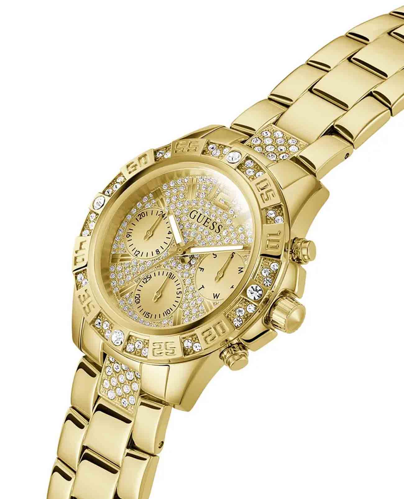 Женские наручные часы Guess Dress GW0771L2 с минеральным стекломМинеральное стеклоМинеральное стекло представляет собой искусственно выращенный минерал кварца. Такое стекло отличается особой устойчивостью к повреждениям и царапинам. Уступает по некоторым качествам сапфировому стеклу., кварцевый механизм с высокой точностью. Корпус часов изготовлен из стали с IP-покрытиемIP-покрытиеМетод ионного напыления. Демонстрирует повышенную устойчивость к истиранию, окислению и химическим веществам. Под воздействием высокого давления и температуры около 1500°C молекулы металла надёжно соединяются с частицами корпуса часов.. БезельБезельВнешний ободок, закрепляющий стекло. В спортивных часах так называется поворотное кольцо с делениями на циферблате, выполняет роль таймера – замеряет отрезки времени на шкале. Неподвижный безель – элемент декора. Однонаправленно вращающийся безель на дайверских часах позволяет фиксировать моменты погружения и выныривания на поверхность. с IP-покрытиемIP-покрытиеМетод ионного напыления. Демонстрирует повышенную устойчивость к истиранию, окислению и химическим веществам. Под воздействием высокого давления и температуры около 1500°C молекулы металла надёжно соединяются с частицами корпуса часов. украшен кристаллами. Стрелки с люминесцентным покрытиемЛюминесцентное покрытиеПозволяет считывать показания времени в темноте. Производители наносят на стрелки, часовые индексы, безель или поверхность циферблата светонакопительный состав, дающий холодное свечение.. Класс водозащиты: 50 метров, позволит защитить корпус от случайных брызг или капель дождя. Стальной браслет с IP-покрытиемIP-покрытиеМетод ионного напыления. Демонстрирует повышенную устойчивость к истиранию, окислению и химическим веществам. Под воздействием высокого давления и температуры около 1500°C молекулы металла надёжно соединяются с частицами корпуса часов. на раскладной застёжкеРаскладная застёжкаТакой тип застёжки используется только на браслетах из металла. Она никогда не раскрывается полностью, происходит разделение на 2 и более частей. Раскладывающая застёжка снизит вероятность потери часов к минимуму..