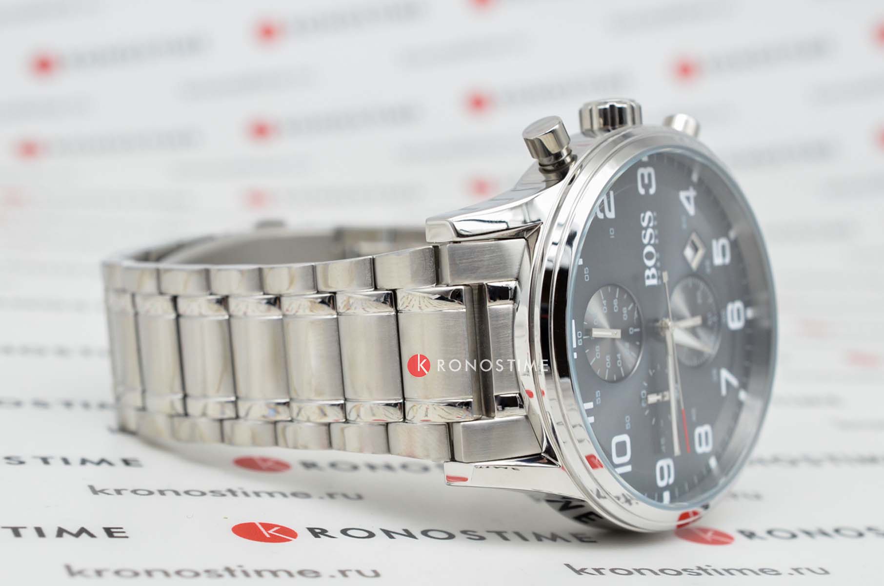 Мужские изысканные часы Hugo Boss Aeroliner HB1513181 сочетают спортивный стиль с функциональностью в корпусе из нержавеющей стали диаметром 44 мм с прочным минеральным стекломМинеральное стеклоМинеральное стекло представляет собой искусственно выращенный минерал кварца. Такое стекло отличается особой устойчивостью к повреждениям и царапинам. Уступает по некоторым качествам сапфировому стеклу., устойчивым к царапинам. Модель оснащена точным кварцевым механизмом с функциями хронографаХронографФункция позволяет измерять отрезки времени с особой точностью: часы, минуты, секунды. Верным признаком хронографа является наличие на циферблате 3 дополнительных окошек-счётчиков. и календарём (индикация даты), а также арабскими метками на чёрном стильном циферблате для оптимальной читаемости. Люминесцентное покрытиеЛюминесцентное покрытиеПозволяет считывать показания времени в темноте. Производители наносят на стрелки, часовые индексы, безель или поверхность циферблата светонакопительный состав, дающий холодное свечение. на стрелках обеспечивает превосходную читаемость показаний даже в самых темных условиях.Стальной браслет на раскладной застежкеРаскладная застёжкаТакой тип застёжки используется только на браслетах из металла. Она никогда не раскрывается полностью, происходит разделение на 2 и более частей. Раскладывающая застёжка снизит вероятность потери часов к минимуму. гарантирует комфорт и безопасность при носке, а водонепроницаемость WR50 (5 атм) защищает от брызг воды и дождя. Эта модель – отличный выбор для тех, кто ищет сочетание стиля, качества и функциональности. Часы станут не только полезным аксессуаром, но и выразительным элементом вашего имиджа.