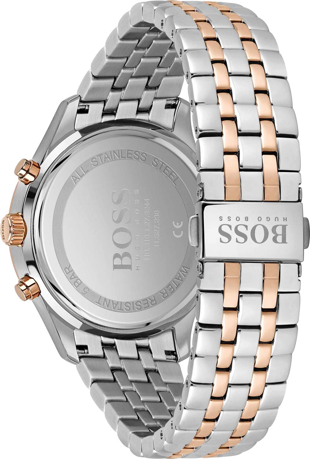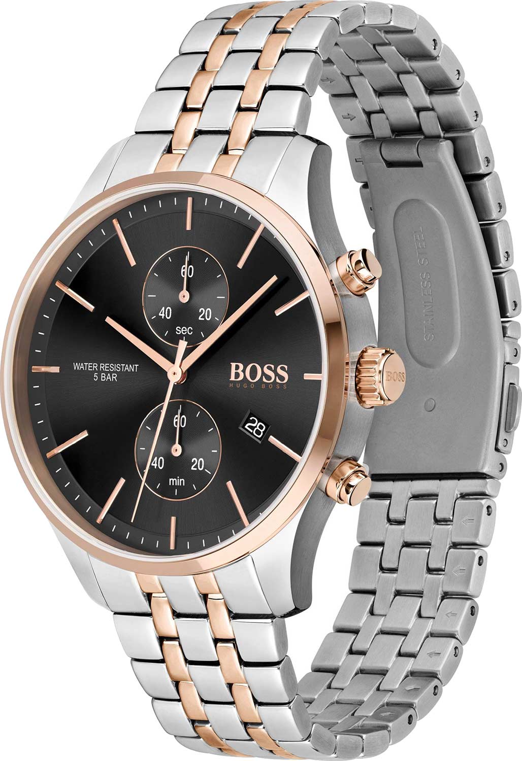 Мужские часы Hugo Boss Associate HB1513840 представлены в круглом 42-мм корпусе из нержавеющей стали с золотистым IP-покрытиемIP-покрытиеМетод ионного напыления. Демонстрирует повышенную устойчивость к истиранию, окислению и химическим веществам. Под воздействием высокого давления и температуры около 1500°C молекулы металла надёжно соединяются с частицами корпуса часов.. Оснащены кварцевым механизмом с функциями хронографаХронографФункция позволяет измерять отрезки времени с особой точностью: часы, минуты, секунды. Верным признаком хронографа является наличие на циферблате 3 дополнительных окошек-счётчиков. и секундомеромСекундомерСекундоме́р — прибор, способный измерять интервалы времени с точностью до долей секунды., а также индикацией даты на позиции 4 часа. Черный циферблат с индексными метками защищен устойчивым к царапинам минеральным стекломМинеральное стеклоМинеральное стекло представляет собой искусственно выращенный минерал кварца. Такое стекло отличается особой устойчивостью к повреждениям и царапинам. Уступает по некоторым качествам сапфировому стеклу.. Стальной браслет IP-покрытиемIP-покрытиеМетод ионного напыления. Демонстрирует повышенную устойчивость к истиранию, окислению и химическим веществам. Под воздействием высокого давления и температуры около 1500°C молекулы металла надёжно соединяются с частицами корпуса часов. дополнен раскладной застёжкойРаскладная застёжкаТакой тип застёжки используется только на браслетах из металла. Она никогда не раскрывается полностью, происходит разделение на 2 и более частей. Раскладывающая застёжка снизит вероятность потери часов к минимуму.. Водонепроницаемость 50 метров (5 ATM) обеспечивает защиту от брызг воды.