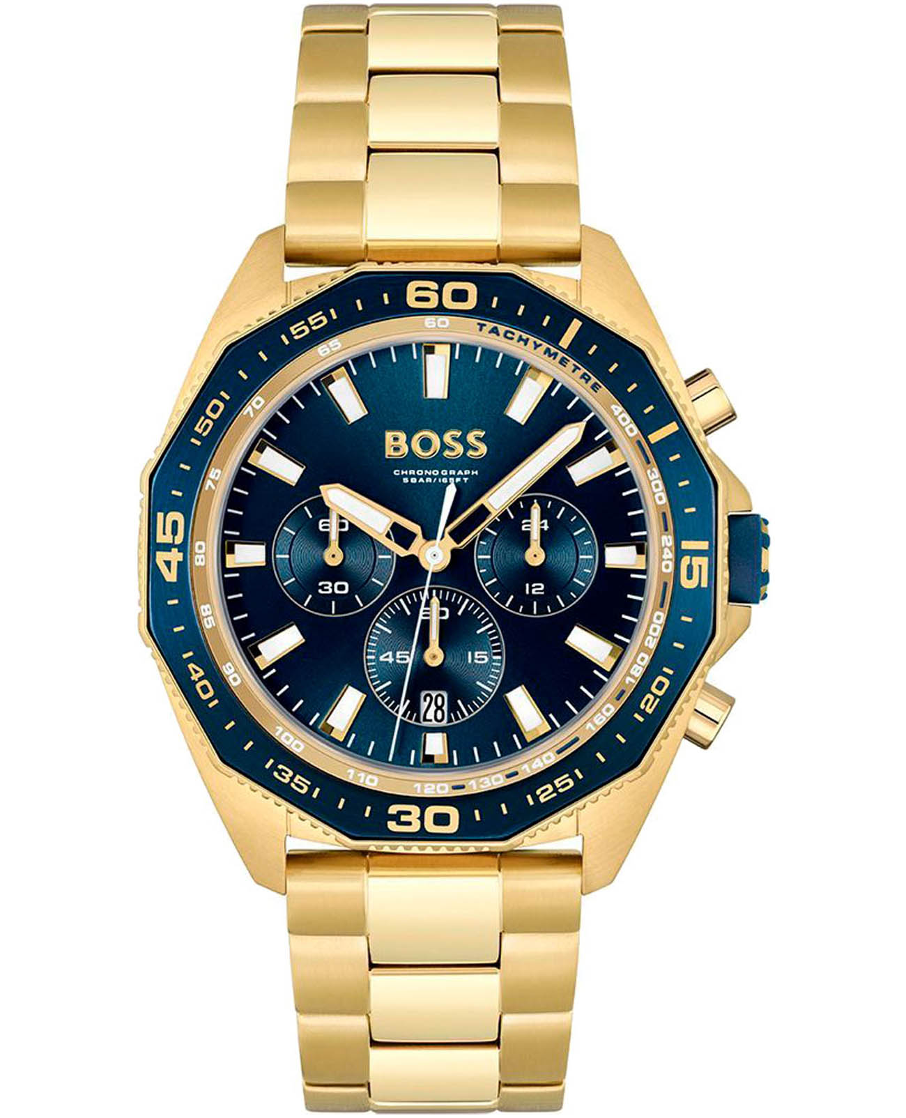 Мужские часы Hugo Boss Energy HB1513973 представлены в круглом 44-мм корпусе из нержавеющей стали с IP-покрытиемIP-покрытиеМетод ионного напыления. Демонстрирует повышенную устойчивость к истиранию, окислению и химическим веществам. Под воздействием высокого давления и температуры около 1500°C молекулы металла надёжно соединяются с частицами корпуса часов.. Оснащены кварцевым механизмом с функциями хронографаХронографФункция позволяет измерять отрезки времени с особой точностью: часы, минуты, секунды. Верным признаком хронографа является наличие на циферблате 3 дополнительных окошек-счётчиков., секундомеромСекундомерСекундоме́р — прибор, способный измерять интервалы времени с точностью до долей секунды. и тахиметромТахиметрРазмеченная шкала, располагается на ободке или безеле часов. Тахиметр позволяет рассчитать скорость на определённом участке пути, расстояние измеряется в километрах или милях. на безелеБезельВнешний ободок, закрепляющий стекло. В спортивных часах так называется поворотное кольцо с делениями на циферблате, выполняет роль таймера – замеряет отрезки времени на шкале. Неподвижный безель – элемент декора. Однонаправленно вращающийся безель на дайверских часах позволяет фиксировать моменты погружения и выныривания на поверхность.. Синий циферблат защищен устойчивым к царапинам минеральным стекломМинеральное стеклоМинеральное стекло представляет собой искусственно выращенный минерал кварца. Такое стекло отличается особой устойчивостью к повреждениям и царапинам. Уступает по некоторым качествам сапфировому стеклу.. Браслет из нержавеющей стали с IP-покрытиемIP-покрытиеМетод ионного напыления. Демонстрирует повышенную устойчивость к истиранию, окислению и химическим веществам. Под воздействием высокого давления и температуры около 1500°C молекулы металла надёжно соединяются с частицами корпуса часов. дополнен раскладной застёжкойРаскладная застёжкаТакой тип застёжки используется только на браслетах из металла. Она никогда не раскрывается полностью, происходит разделение на 2 и более частей. Раскладывающая застёжка снизит вероятность потери часов к минимуму., а стрелки покрыты люминесцентным составомЛюминесцентное покрытиеПозволяет считывать показания времени в темноте. Производители наносят на стрелки, часовые индексы, безель или поверхность циферблата светонакопительный состав, дающий холодное свечение. для видимости в темноте. Водонепроницаемость 50 метров (5 ATM) позволяет использовать часы для плавания.