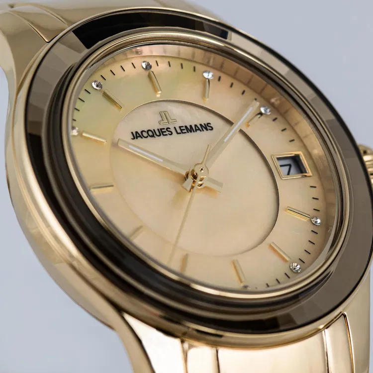 Австрийские женские часы Jacques Lemans 1-2194G имеют кварцевый механизм с высокой точностью. Минеральное стеклоМинеральное стеклоМинеральное стекло представляет собой искусственно выращенный минерал кварца. Такое стекло отличается особой устойчивостью к повреждениям и царапинам. Уступает по некоторым качествам сапфировому стеклу., устойчивое к появлению царапин, обладает высокой прозрачностью. Корпус часов изготовлен из нержавеющей стали с PVD-покрытиемPVDУльтратонкое покрытие наносится в технике вакуумного напыления, сочетает в себе нитрид титана особой прочности со слоем золота или оксида хрома. Несёт в себе декоративную или защитную функцию.. Стрелки с люминесцентным покрытиемЛюминесцентное покрытиеПозволяет считывать показания времени в темноте. Производители наносят на стрелки, часовые индексы, безель или поверхность циферблата светонакопительный состав, дающий холодное свечение.. Класс водозащиты: 50 метров, позволит принимать душ или плавать, не снимая часов. Стальной браслет на раскладной застёжкеРаскладная застёжкаТакой тип застёжки используется только на браслетах из металла. Она никогда не раскрывается полностью, происходит разделение на 2 и более частей. Раскладывающая застёжка снизит вероятность потери часов к минимуму..