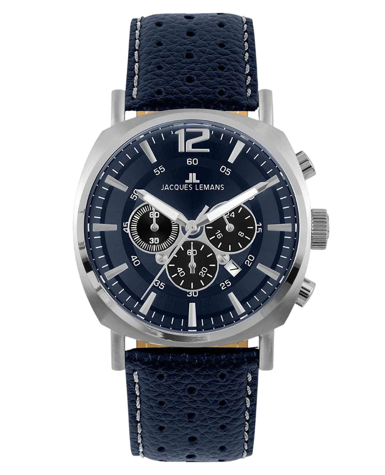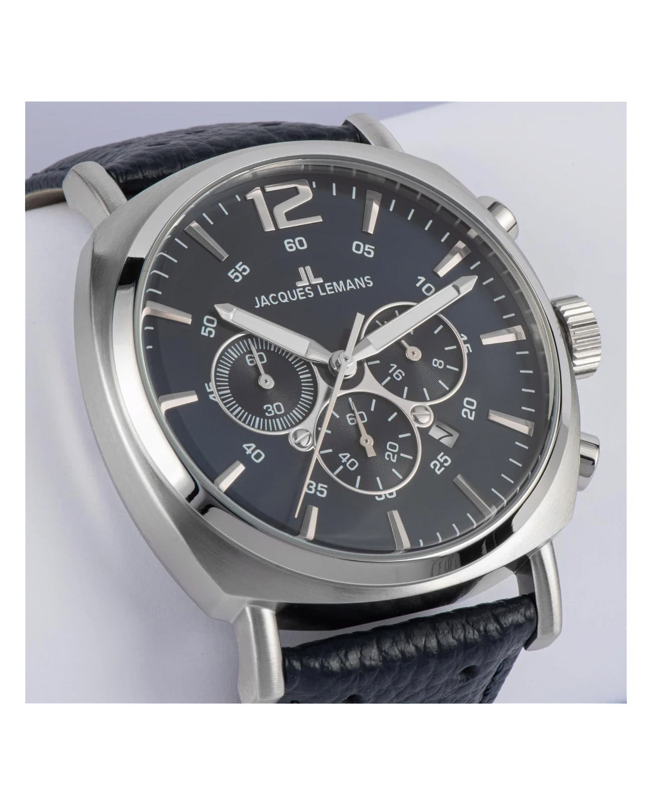 Мужские наручные часы c хронографомХронографФункция позволяет измерять отрезки времени с особой точностью: часы, минуты, секунды. Верным признаком хронографа является наличие на циферблате 3 дополнительных окошек-счётчиков. Jacques Lemans Lugano 1-1645Q, кварцевый механизм с высокой точностью. Минеральное стеклоМинеральное стеклоМинеральное стекло представляет собой искусственно выращенный минерал кварца. Такое стекло отличается особой устойчивостью к повреждениям и царапинам. Уступает по некоторым качествам сапфировому стеклу. устойчивое к мелким механическим повреждениям. Корпус часов изготовлен из стали. На циферблате три дополнительных индикатора. Стрелки и метки с люминесцентным покрытиемЛюминесцентное покрытиеПозволяет считывать показания времени в темноте. Производители наносят на стрелки, часовые индексы, безель или поверхность циферблата светонакопительный состав, дающий холодное свечение.. Окошко даты находится между 4 и 5 часами. Класс водозащиты: 100 метров, позволит плавать, нырять и заниматься другими водными видами спорта. Кожаный ремешок на стандартной застёжке.