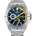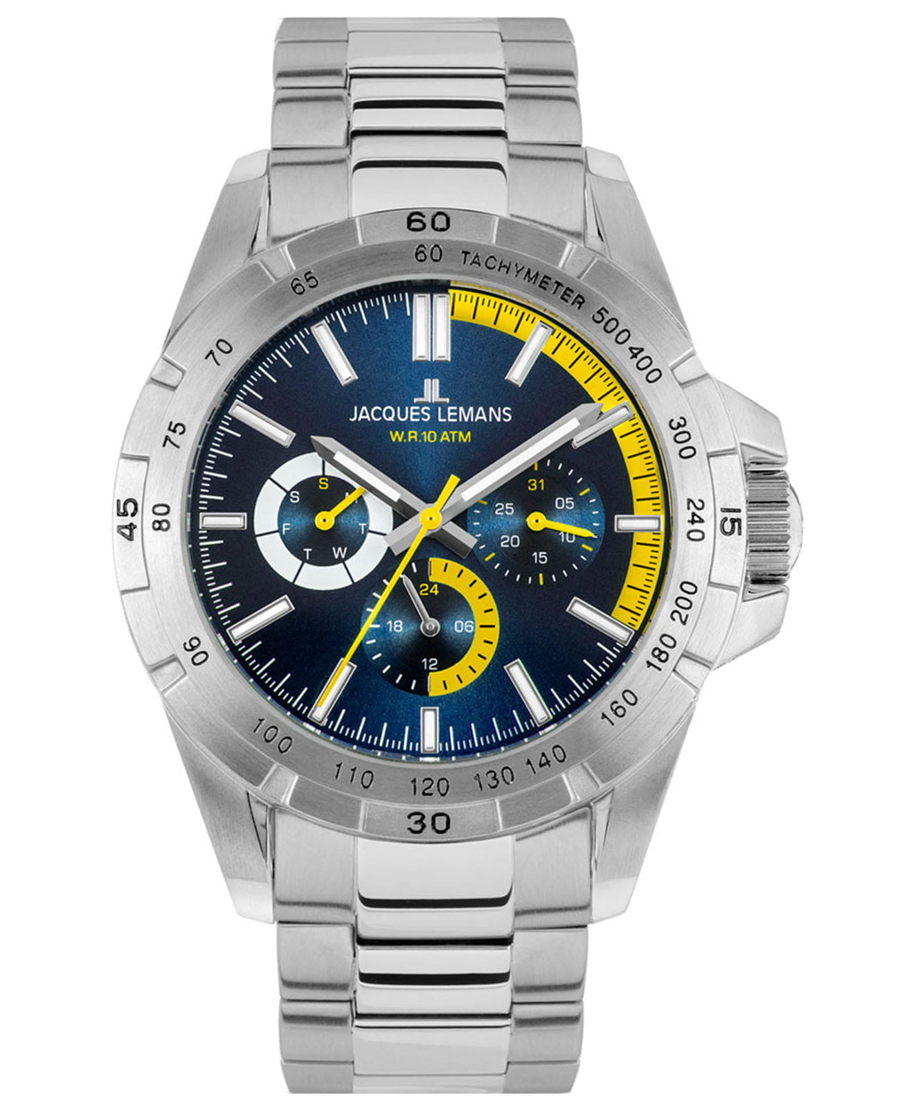 Многофункциональные часы 42-11 выполнены в эффектном спортивном стиле. Корпус диаметром 41 мм сделан из гипоаллергенной нержавеющей стали. На широкий БезельБезельВнешний ободок, закрепляющий стекло. В спортивных часах так называется поворотное кольцо с делениями на циферблате, выполняет роль таймера – замеряет отрезки времени на шкале. Неподвижный безель – элемент декора. Однонаправленно вращающийся безель на дайверских часах позволяет фиксировать моменты погружения и выныривания на поверхность., помимо тахиметрической шкалы, вынесена дополнительная индикация секунд. Для удобной заводной головки конструкцией корпуса предусмотрена специальная защита. Комбинация синего и желтого цветов притягивает внимание при первом же взгляде на циферблат часов. Визуально выделены 20-минутный отрезок, индикатор 24-х часов, стрелки индикаторов даты и дня недели. Крупные центральные стрелки и риски будут хорошо читаться при любом освещении или его отсутствии: они покрыты люминесцентным составомЛюминесцентное покрытиеПозволяет считывать показания времени в темноте. Производители наносят на стрелки, часовые индексы, безель или поверхность циферблата светонакопительный состав, дающий холодное свечение., который светится в темноте. В модели установлено ударопрочное Минеральное стеклоМинеральное стеклоМинеральное стекло представляет собой искусственно выращенный минерал кварца. Такое стекло отличается особой устойчивостью к повреждениям и царапинам. Уступает по некоторым качествам сапфировому стеклу. Crystex. Повышенная водостойкость равна 10 атмосфер. Раскладная застёжкаРаскладная застёжкаТакой тип застёжки используется только на браслетах из металла. Она никогда не раскрывается полностью, происходит разделение на 2 и более частей. Раскладывающая застёжка снизит вероятность потери часов к минимуму. надежно удерживает на запястье браслет из нержавеющей стали с полировкой. Часы 42-11 хорошо сочетаются со спортивной формой, одновременно с этим, они могут стать ярким элементом образа в стиле casual.
